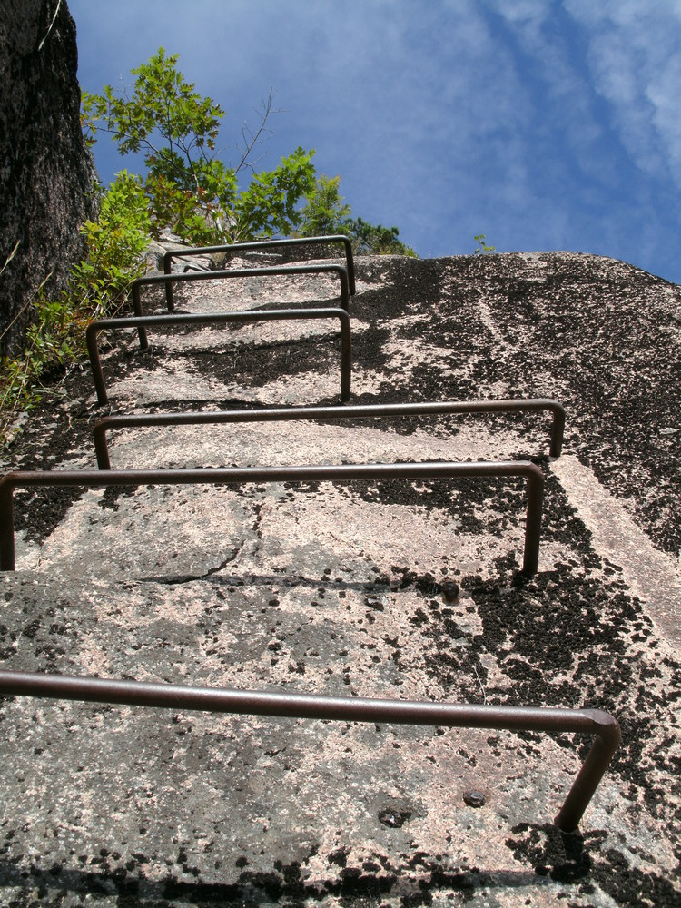 The Precipice Trail begins with a traverse of rugged talus slope. A wooden bridge and occasional iron handrail allow climbers to traverse narrow, exposed ledges. At the junction with the Orange and Black Path, the Precipice Trail continues to the left. Several series of long iron rungs and ladders lead up the open, vertical cliff face. Upon reaching the summit of Champlain Mountain, climbers are rewarded with impressive views.