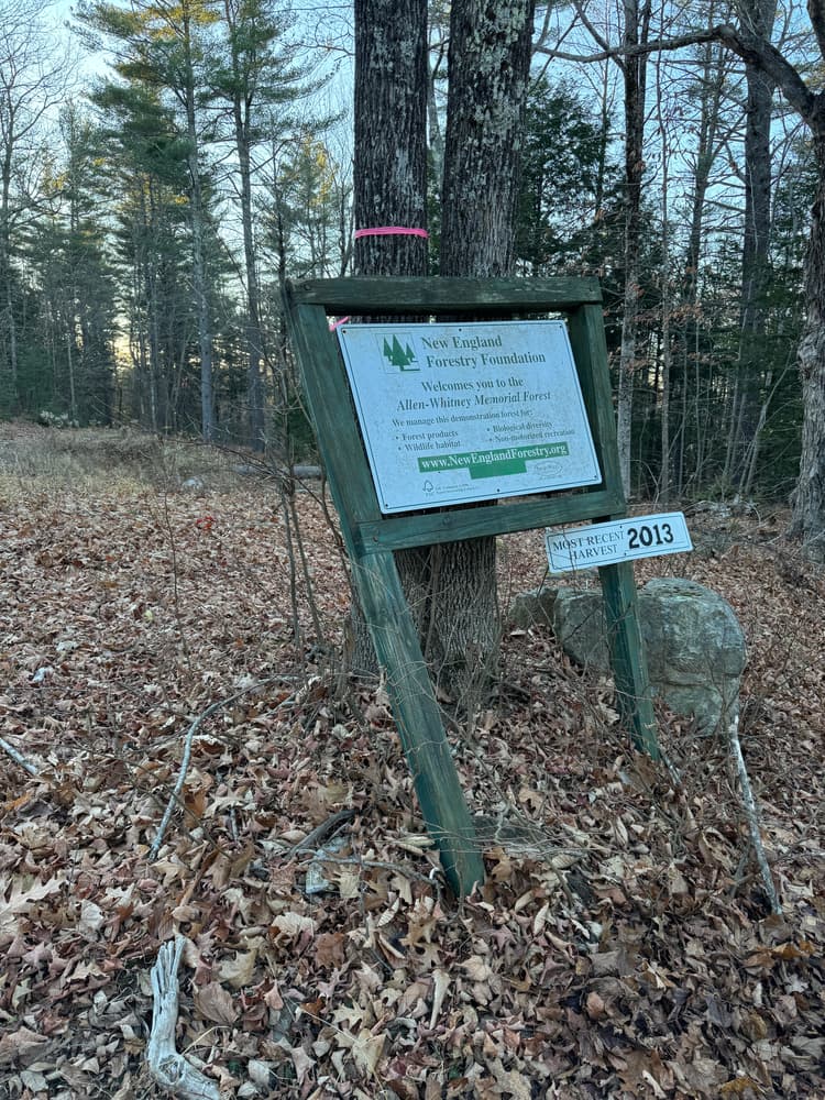 Portions of this land were settled by the Allen family during colonial times. The Allen family was active in the publishing business and owned considerable commercial property in downtown Augusta. Mr. Edward A.Whitney was on the faculty of Harvard University, where he met John Hemenway and became acquainted with the New England Forestry Foundation (NEFF). He deeded the first parcel of this forest to NEFF in 1955. The property has been under continuous management by NEFF since 1950 when a forest management plan was prepared by forester A.W. Neff. The first timber sale was made in 1950 when 225,000 board feet of marked timber were sold for the stumpage price of $9.07/mbf. Additional timber cuts have been made regularly since 1950. Tree planting on the abandoned fields was begun by Mr. Whitney in the 1940s and continued until 1961. Sixty-one thousand trees were planted under the Soil Bank program. All of the plantations have been thinned except for a few acres south of the former summer house. An internal road system was constructed in the early 1960s, providing access to all portions of the property. In recent years, NEFF has been teaming up with Manomet to establish management planning that grapples with the potential issues facing landowners due to climate change. This has included experimental management in eastern hemlock and white ash stands, as well incorporating invasive species assays into regular timber inventorys.
