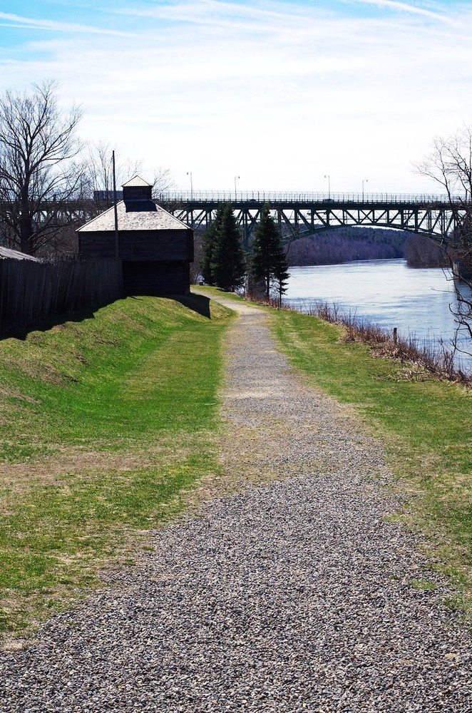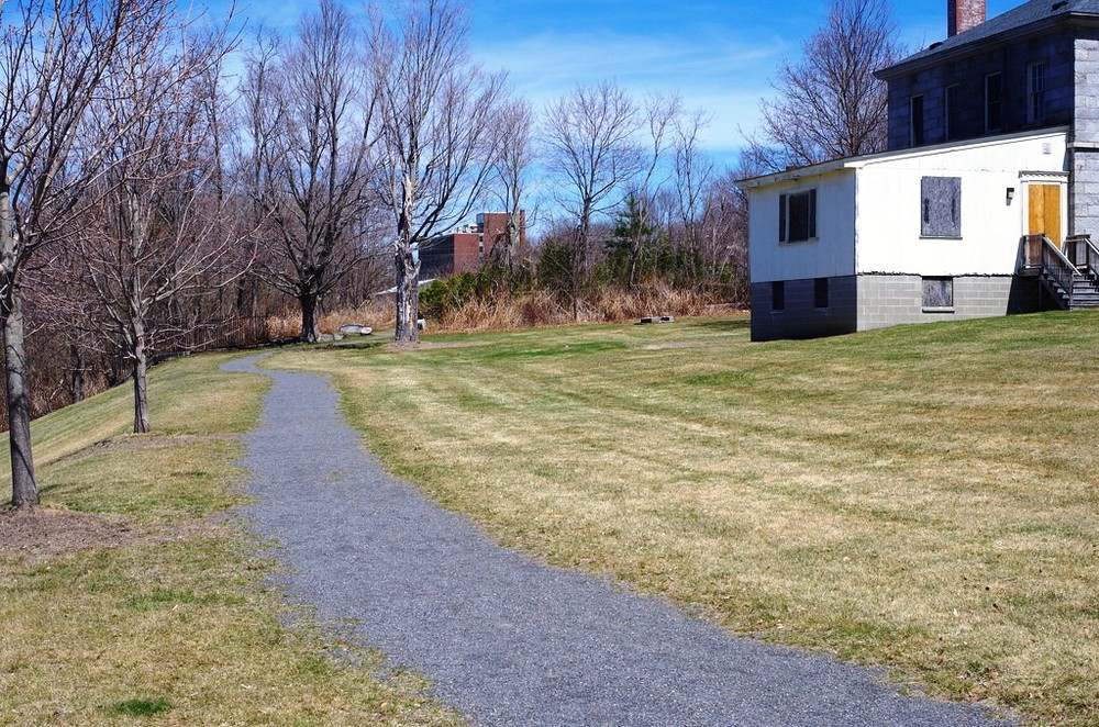 At about the halfway point, the trail climbs a slight rise and comes into an open area, passing by the Kennebec Arsenal site. The Arsenal grounds are currently closed to exploration, but the trail across the property is open to trail users. Just south of the open Arsenal area and adjacent parking lot (closed to vehicles), the trail swings left up a small hillside before joining the sidewalk along Arsenal Street. This point serves as the current end of trail, though there are sidewalk connections (see below).