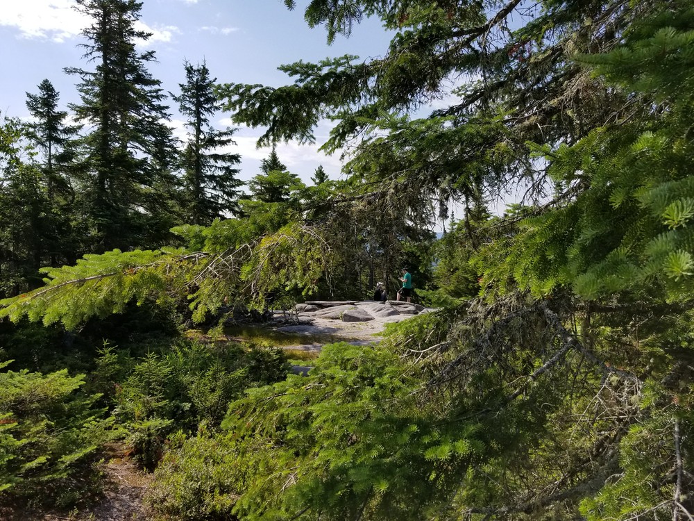 The alternative start at the boating parking lot near Haine’s Landing adds some distance to the overall hike, as it involves roughly one mile of trail before joining the main trail 1200 feet above the primary Bald Mountain parking lot. This trail passes through dense softwood, open logging road, bog, and young hardwoods while following a gentle slope. It includes bog bridging to cross wet areas. There is evidence along the trail of the mountain’s former life as a minor ski hill decades ago.