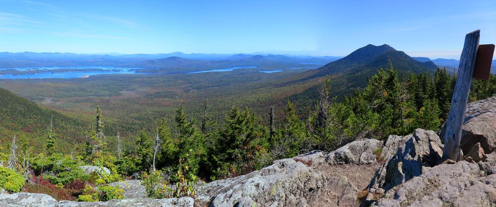 The trail comes out into open ledges and, again, ascends steeply to the summit of Cranberry Peak (3213'), 2.9 miles from Curry Road. On the summit, striking views of much of the Bigelow Range, the Crockers, Sugarloaf, and many more mountains can be seen on a clear day. For the day hike and a 5.8-mile round trip, turn back here. The trail continues 1.7 miles past Cranberry Peak to connect with the Appalachian Trail and the rest of the Bigelow Preserve for a considerably longer hike.