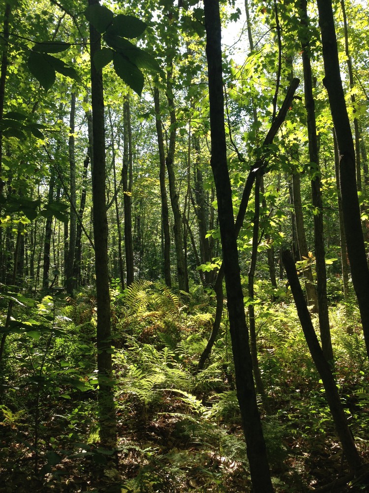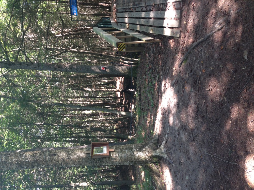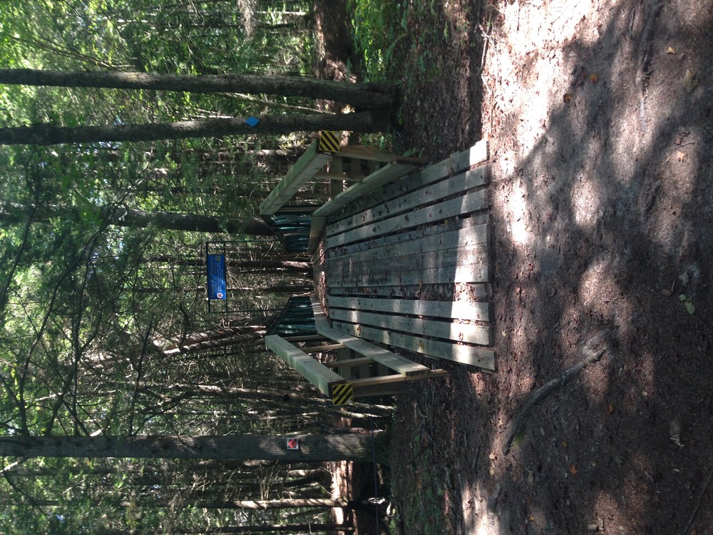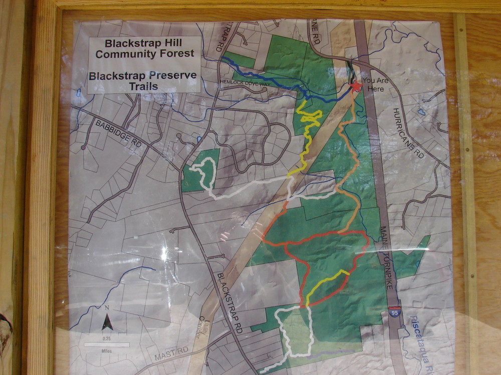 The Blackstrap Community Forest Trails include a mix of older snowmobile trails that are generally eroded and in poor shape for hiking or mountain biking and newer hiking/mt. biking singletrack. The more southern trails, accessed from the top of the ridge at the Blackstrap Rd. parking lot, travel through dense, wet forest. There is approximately 300 feet elevation change between the bottom of these trails at the river level and the parking lot. The shorter (blue) loop does not have this magnitude of elevation change. The northern trails are most easily accessed from the Hurricane Road trailhead. The Orange trail along the West Branch of the Piscataqua River is a flat trail and the most direct access to the hill trails on the Blackstrap Ridge. Several new twisty mountain-bike trails loop up and down the hill immediately south of the powerline. Two other trails ascend from the parking lot up the hill. The middle trail is a twisty mountain bike trail that eventually crosses the powerline to enter the system of trails south of the powerline.
