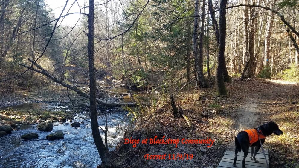 Blackstrap Road Trailhead: Follow Blackstrap Road a quarter mile north of its intersection with Mountain Road and look for the trailhead on the right side. From the north, Follow Blackstrap Road south a quarter mile south of its intersection with Mast Road and look for the trailhead on the left. There is a parking lot with an accompanying sign.