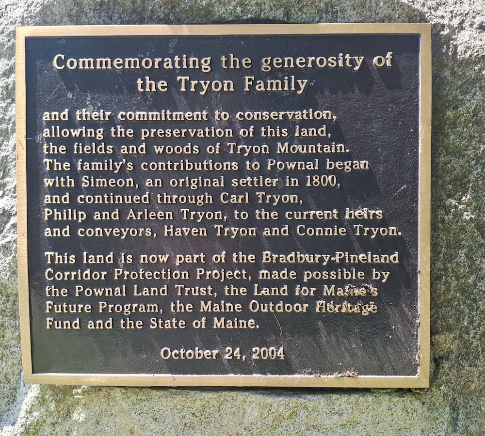 The multi-use Bradbury-Pineland Corridor Trail begins at the junction with the Boundary Trail in the northwest corner of Bradbury Mountain State Park. From here, the trail heads west past Thoits Branch, and then a spur trail of under 0.2 miles heads up to the summit of Tryon Mountain. At the summit there are old quarries and opportunities to explore for minerals. As the trail winds through deep woods old stone walls may be spotted.
