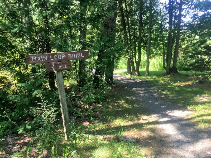 The trail begins from two entrances at the parking area, allowing hikers to loop in either direction through forested wetland, along the Main Loop Trail, or optionally continuing on the Back Loop Trail, which also provides access to a spur trail to a pond. Along with the tall pines, there are tree species such as larch, northern white cedar and Siberian elm. The delicate and beautiful pink lady slipper can be found here in the spring; just be sure to look and not touch, as they are relatively rare. The forest also includes a stand of hardwoods including northern red oak, American beech and paper birch, with areas of bracken and Canada mayflower (wild lily of the valley) beneath.
