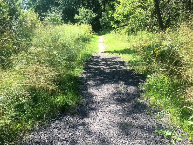 The Main Loop is of mostly easy grades, with a couple segments that have a grade of up to 6%. It is narrower at its two entrances from the parking lot, closer to 4 feet wide, and with a couple large rocks near the southern entrance with about 3.5-foot between them, and with encroachments by grass near the northern entrance narrowing the gravel to about a foot or two of gravel, with the grass beyond this at the edges on either side.
