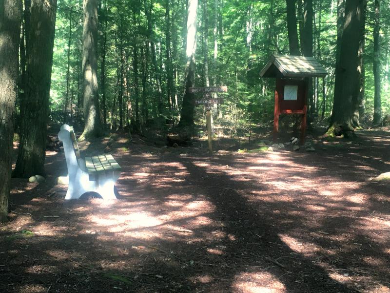 The Main Loop and Back Loop are accessible via wheelchair; the Pipeline Trail, the spur trail to the pond, and the path cutting through the center of the loop are narrower and have a surface of dirt and leaf litter. The Main Loop and Back Loop are about 7-feet wide, with a surface of gravel, packed dirt, and pine needles. There are sometimes roots and rocks sticking up from the otherwise flat surface.