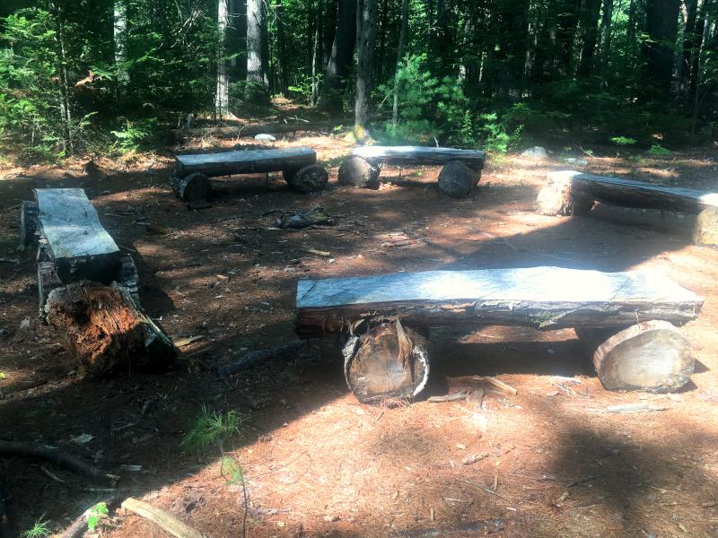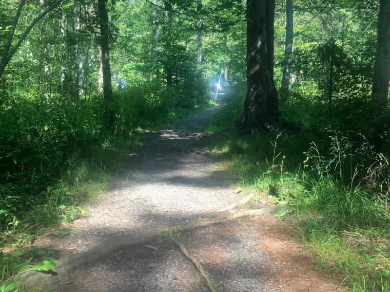 Back on the Main Loop after completing the Back Loop, the trail travels under balsam fir with a carpet of blue-bead lily and eastern starflower. The trail passes by the narrower path (on the right) cutting through the center of the network, and then continues under many more tall pines. There is a small clearing through which the trail becomes somewhat grassy at its edges just before returning to the parking area.