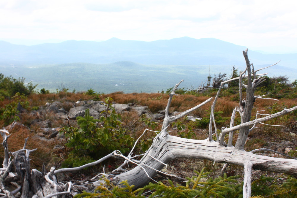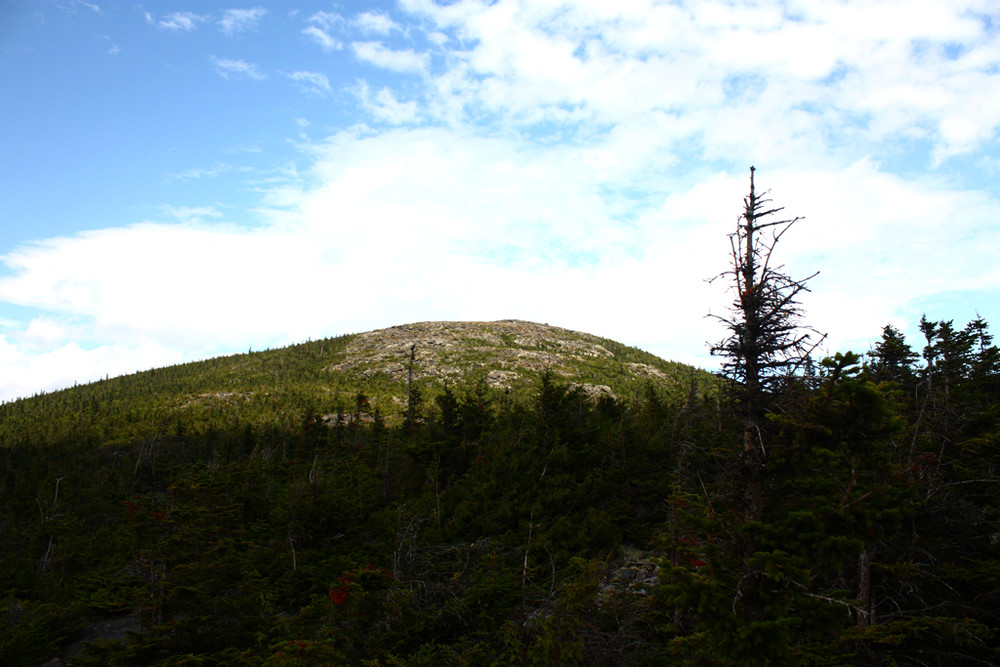 After the first section, the trail follows a steeper grade, leading the hiker over roots and rocks. As the trail approaches the summit the trees start to thin out and become dwarfed as the elevation nears the alpine zone. When the trail breaks out of the trees there is a view of the summit as well as an unobstructed view of the majestic Bigelow Range.