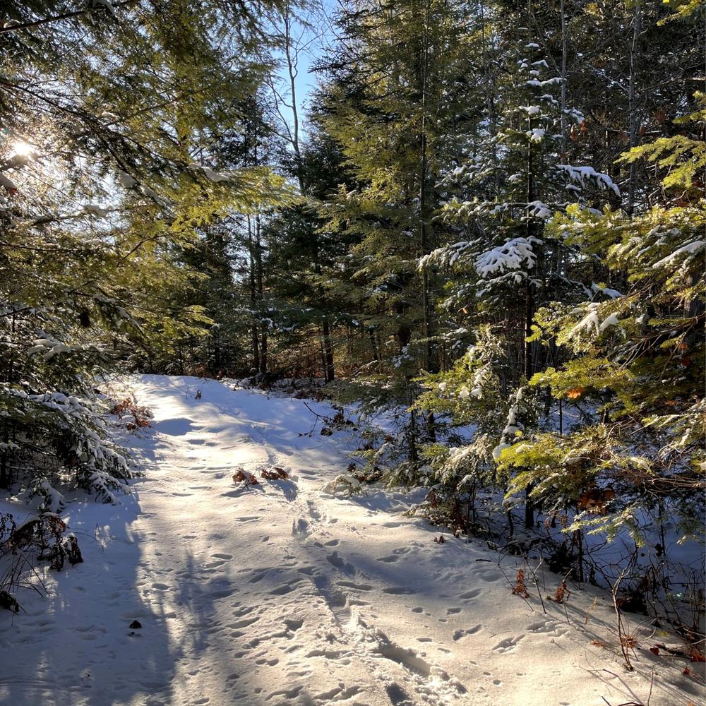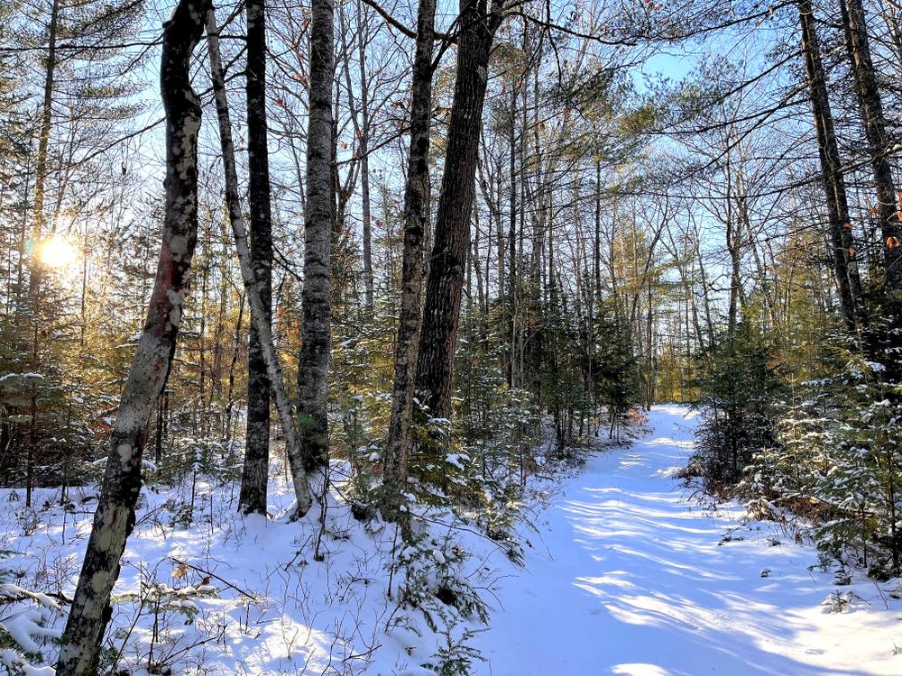 The property is challenging to access except on frozen ground, so it is open only in the winter. Trailhead parking is typically plowed, and the winter trails are seasonally marked for skiing and snowshoeing. Map panels are installed at the trailhead and at the two major intersections. The trail crosses through shallow wet areas in the utility corridor; stay alert on warmer days to avoid wet skis!