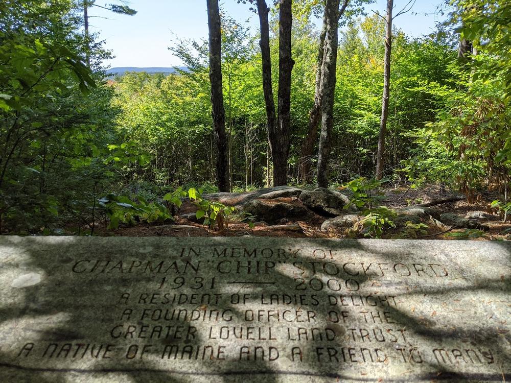 A short spur trail, marked in red leads to a memorial bench and view vista overlooking the Lower Bay of Kezar Lake, the expansive Kezar Oulet Fen and the hills that make up Robbin’s Ridge.