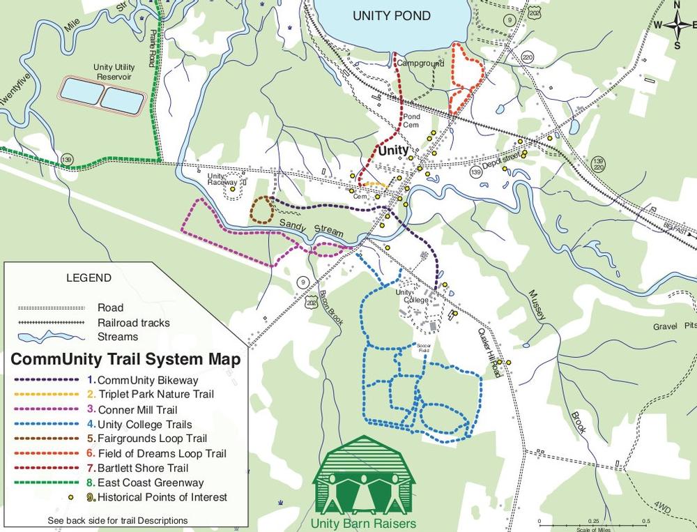 The Bikeway includes a half mile of the Hills to Sea Trail between Unity College and US-202, sweeping through a large field near the College, then over a bridge crossing Sandy Stream. The Bikeway continues an additional half mile on the west side of US-202 to connect with the CommUnity Trails Fairground Loop. It is 10 feet wide with a stone dust surface east of US-202, and somewhat narrower west of US-202, and ideal for walking, dog-walking, jogging, biking, and cross-country skiing. The trail is mostly flat with two slight rises behind the Unity Elementary School.