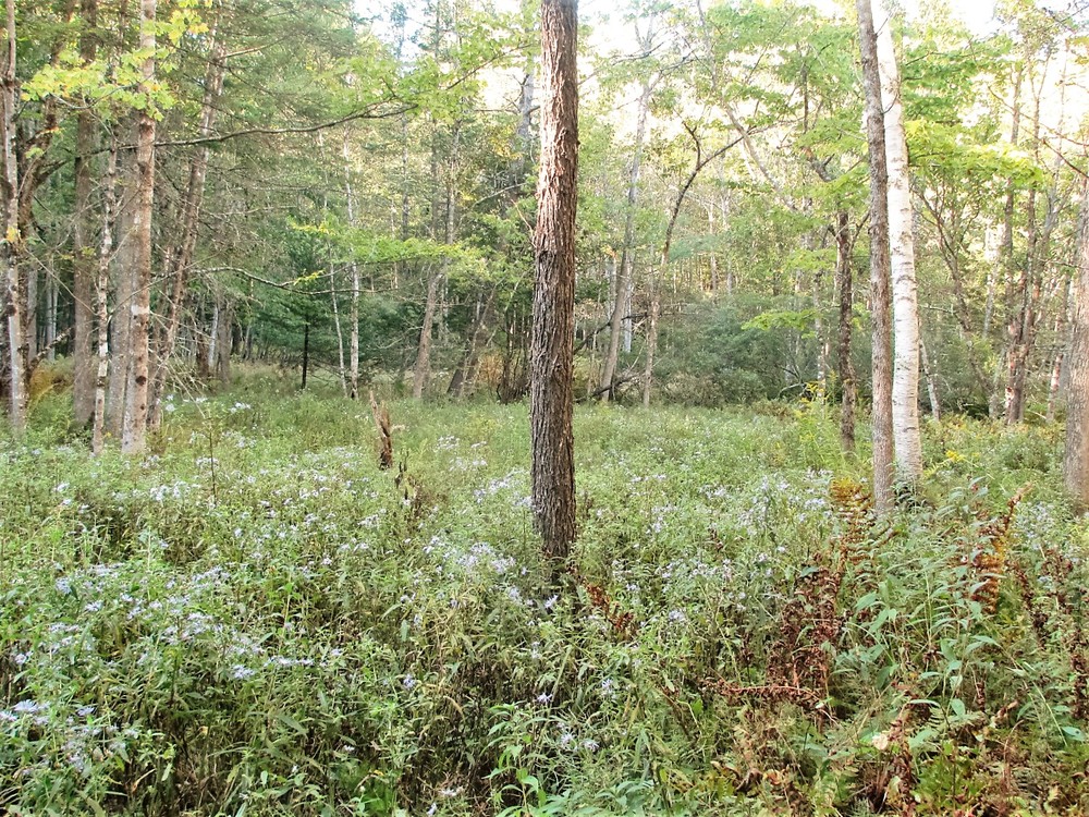 The northern network of trails can be accessed at several points along the first 0.4 miles of the White Trail, not far from the trailhead. These trails are blazed Orange #4, Blue, Yellow #3, Green/Lime #5, and Red/Green. They extend to the old stone wall which runs along the northern property boundary and pass by beautiful wildflower meadows and open woods thickly carpeted in ferns.