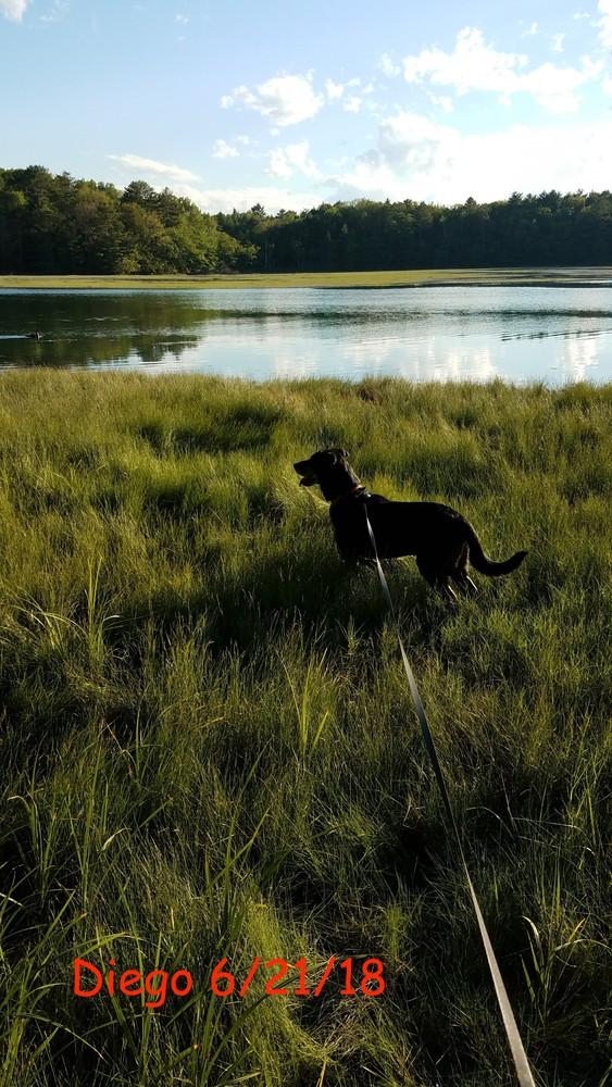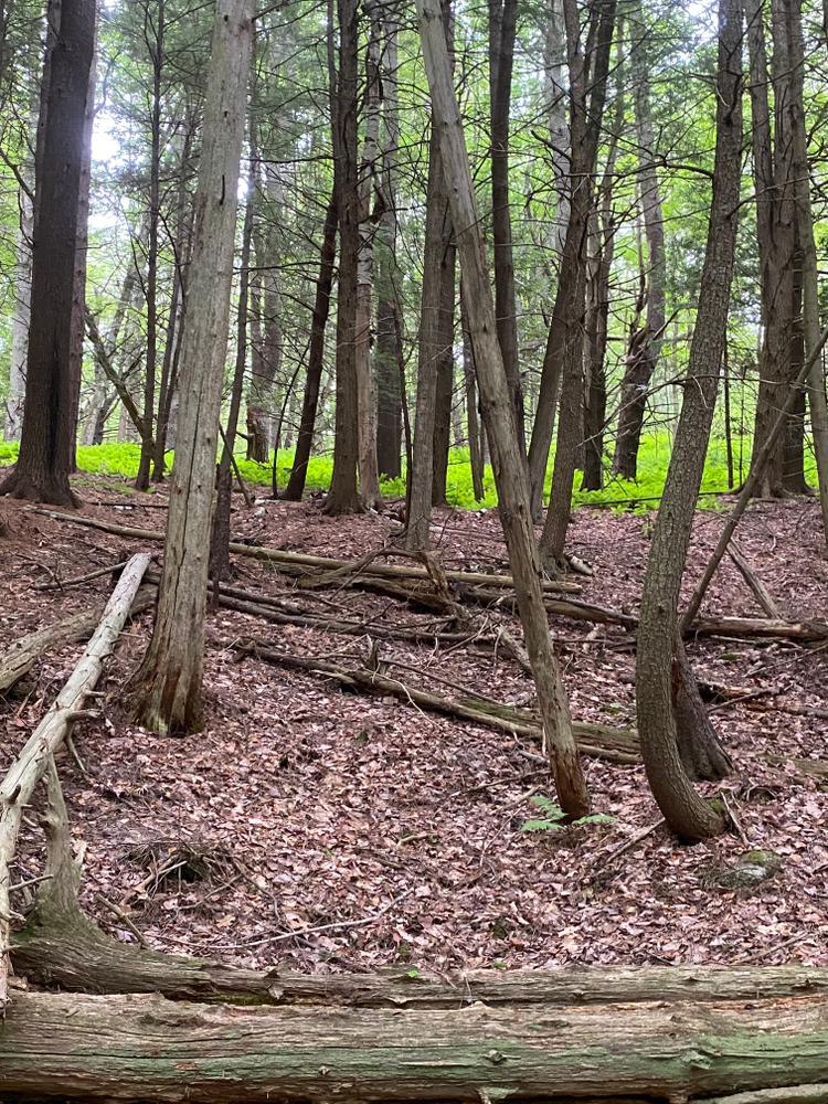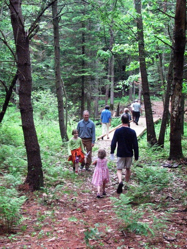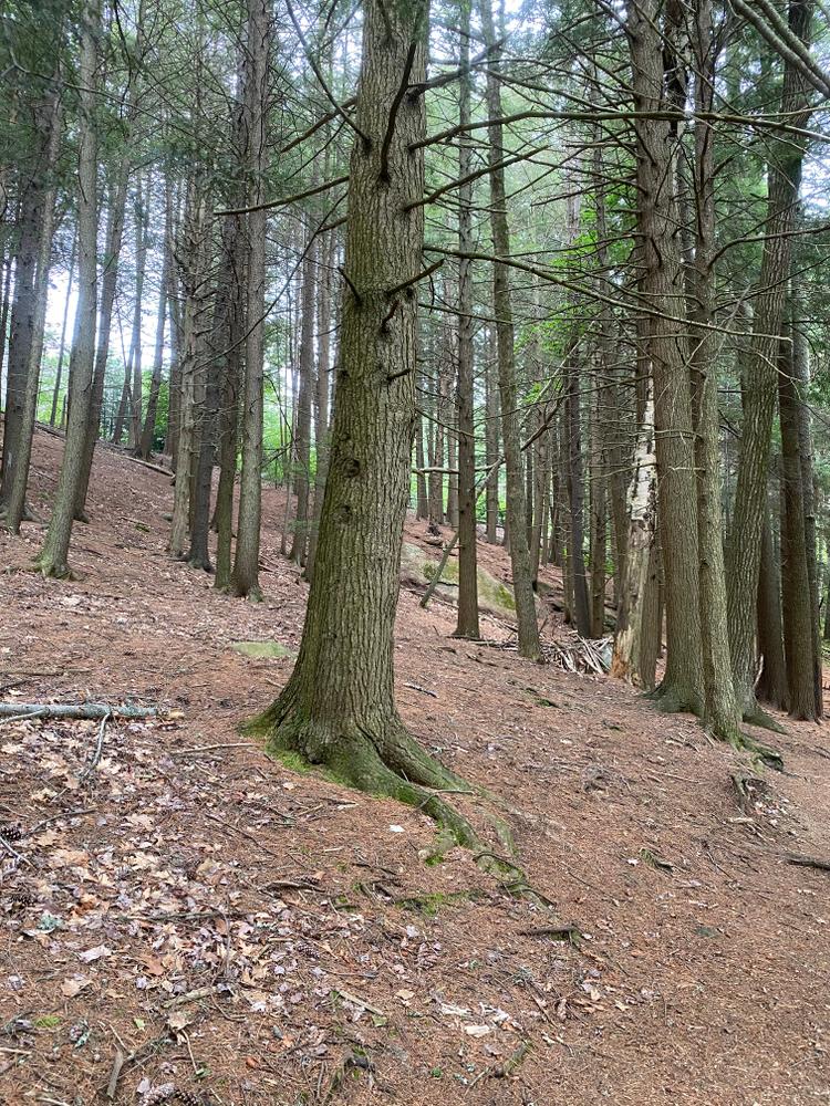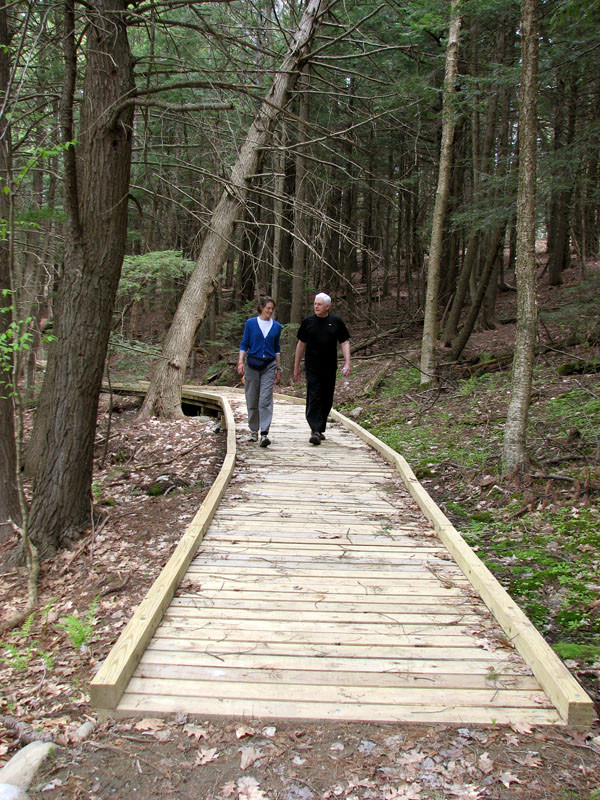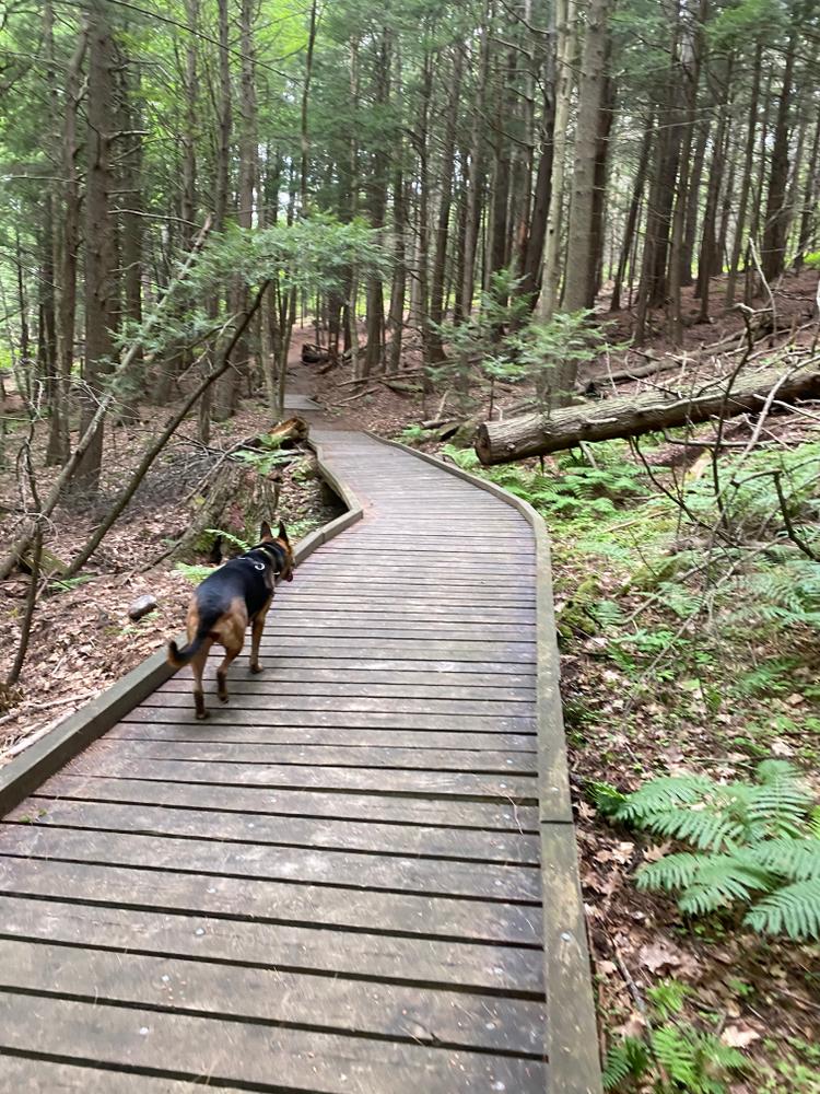 The trail starts uphill and then goes into the woods and flattens out before climbing another hill. The tree markings are clear, and elevated walkways have been installed where there is mud or a wet area. Dogs are allowed off leash here, but please clean up after your pet.