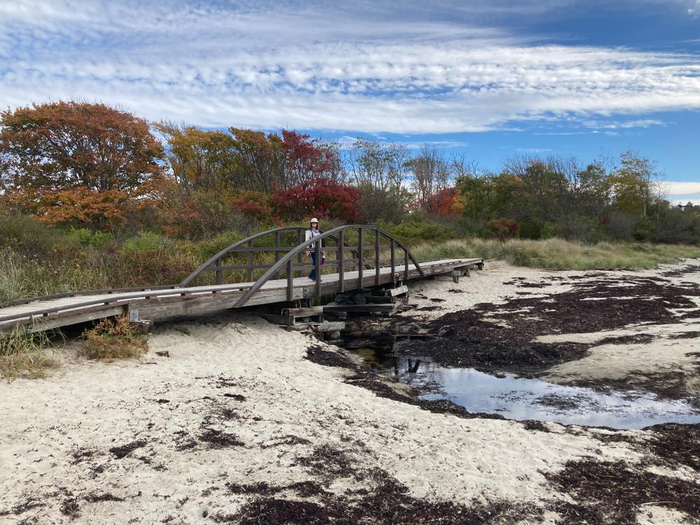 At the western end of Crescent Beach State Park, one can explore a rocky area for small sea creatures or find a trail that takes the hiker through a meadow that continues offering fantastic views of the water, an old apple orchard, and nearby Richmond Island. The meadow is periodically mowed to continue its abundance of milkweed, attracting many monarch butterflies each late summer and fall. Milkweed is the only plant that its larvae can eat and is essential to the life cycle of this butterfly. This short trail will lead to an old fire road that meanders through the woods and ends on the entrance road to the park. The hiker can return along this entrance road to the main parking area.