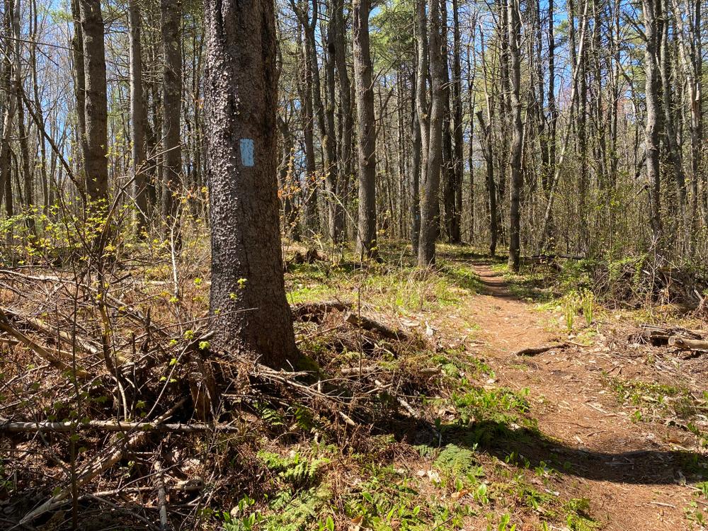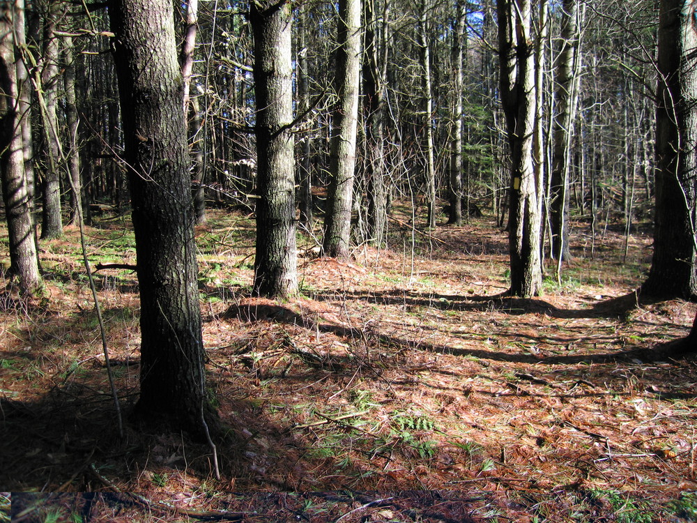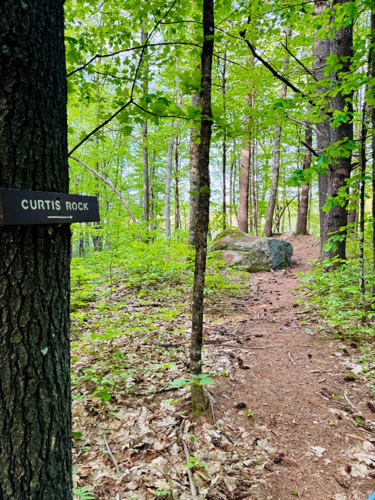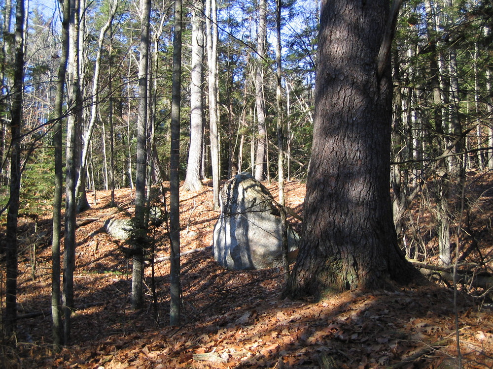 Upper Fields Loop Trail (easy, 0.5 mile loop): This trail creates a loop with the Curtis Rock Trail. At the first stone wall, the trail loops back around to the field. Just 60 years ago, in 1940, the land on either side of this trail was not forested, but was in fields for hay or cultivated crops.