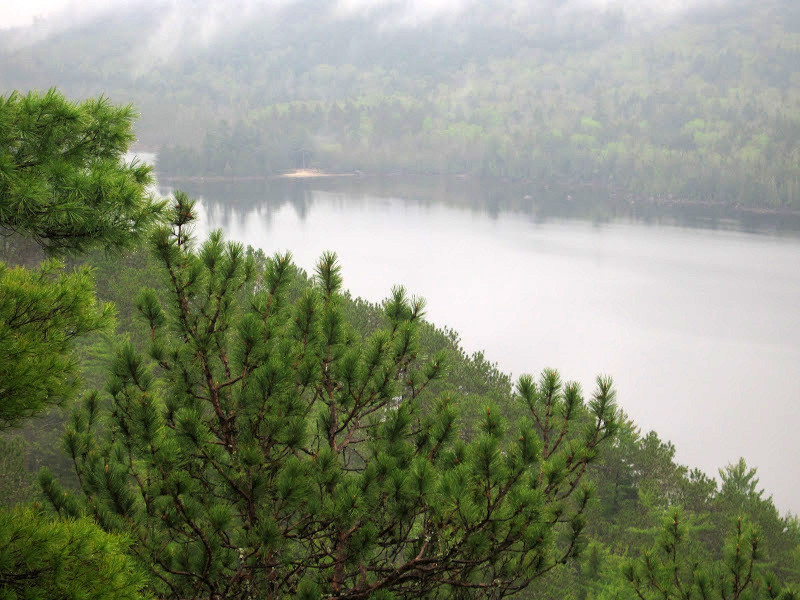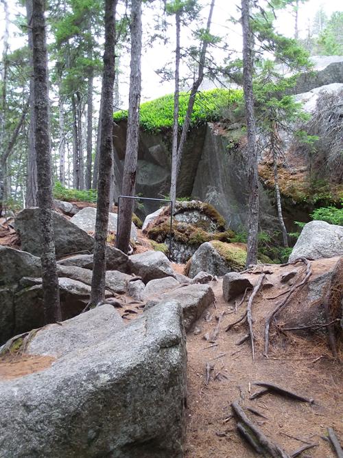 The trail starts out a little rough as you traverse roots and rocks, so watch your footing, but that's typical of a lot of trails in Maine. Along the hike are huge fern-covered boulders that could only have been placed there by glacier movement. The hike was mostly through red and white pine. Near the end of the trail, you have the option to turn right up to the overlook or turn left down to the ice caves. We opted for both. The overlook provides pretty views of First Debsconeag Lake. It's only 1/10th mile from the intersection, so it's well-worth the minimal effort to get there. After the overlook we headed directly to the ice caves about 2/10th of a mile from the intersection. There are metal rungs built into the wall in one of the caves for those interested in descending into it. Very cool both literally and figuratively. When we were there, someone tied a climbing rope in place, allowing you to get to the bottom of the cave. It was July and there was still plenty of ice in the cave. A flashlight or headlamp are definitely needed if you want to go into the cave.