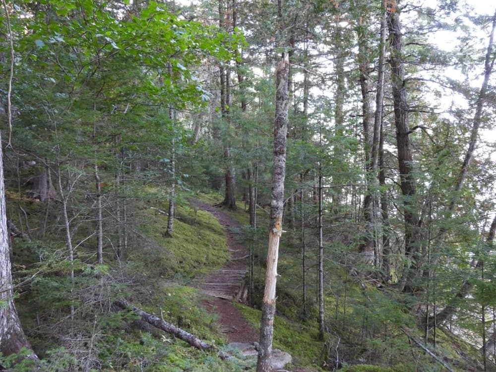 The Shoreline Bluffs Trail leaves from the parking and trailhead on the north side of the access road. Completed in 2016, this hike leads to rocky bluffs overlooking the St. Croix River and New Brunswick. Hikers will encounter large trees including red and sugar maple, white and yellow birch, hemlock, white cedar, red and white spruce, and white pine that survived pre-park logging, and the stumps of many that did not. Pileated woodpeckers may be heard or seen in the big trees, and bald eagles, ospreys, loons and ducks frequent the shorelines. Deer, moose, coyotes, red foxes, beavers, and mink, less often seen, may visit the woods or marsh