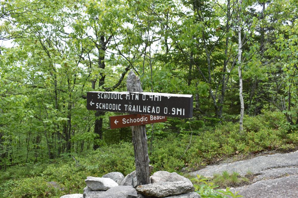 Parking Area to Schoodic Mountain summit (1.3 miles one way, moderate): The trail leaves the parking area near the outhouse and travels through the woods and across several streams before beginning a steep climb towards the summit. At 0.9 miles, the trail crosses some open ledges and converges with the trail from Schoodic Beach. Continue over ledges for 0.4 miles to the summit.