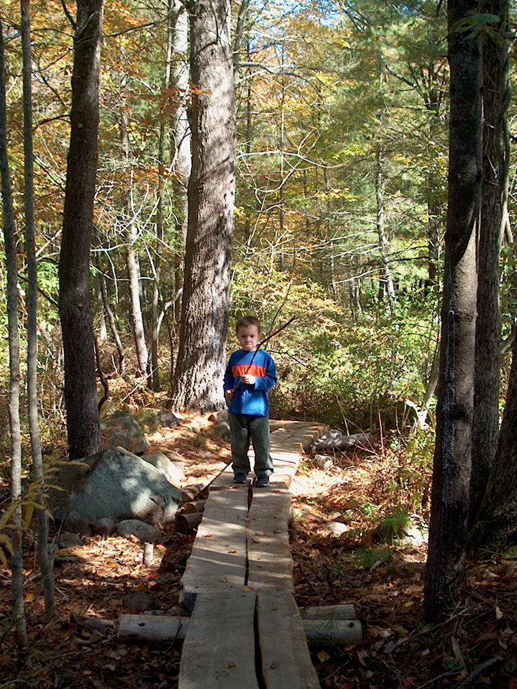The trail begins behind the grange hall. The approach to the start of the trail is down a steep washed out hill, ending in a set of log steps leading into the woods. The trail heads down steeply for a good distance before turning back towards the other trailhead to the south.