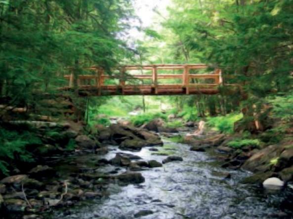 Traveling through a preserve that protects wild Atlantic salmon habitat, this trail crosses the river on a long wooden bridge and offers good opportunities for bird watching and spotting wildlife.