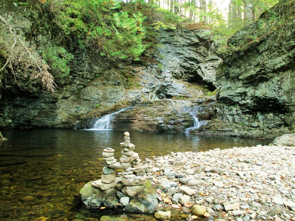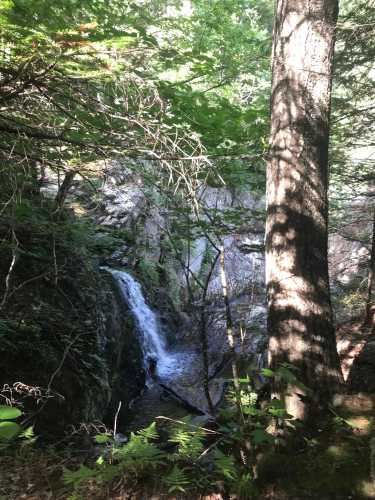 To continue to Upper Dunn Falls, cross the West Branch of the Ellis River, turning north on the Appalachian Trail. Once across the river, the trail ascends a short, yet steep bank to another small clearing. Here, the blue-blazed Cascade Trail departs the Appalachian Trail and turns uphill and northwest towards Upper Dunn Falls. The Cascade Trail reaches the Upper Falls in less than 0.25 miles, but features several short ascents of steep banks and at times passes very near the drop-off to the river below. Along the way to Upper Dunn Falls, several smaller, but equally spectacular falls may be accessed from the trail. The Cascade Trail ends at the base of Upper Dunn Falls and overlooks a small gorge at the confluence of two streams below the long drop of Upper Dunn Falls.