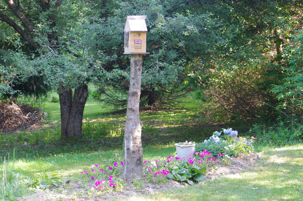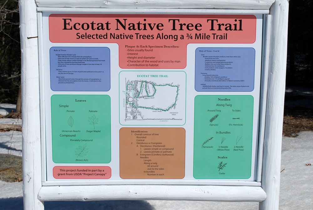 Ecotat Gardens and Arboretum is an 88 acre site consisting of about 15 acres of gardens interplanted with mostly non native trees and shrubs, many with permanent labels. Each season more than 60 gardens provide a predictable sequence of blooms. Mature second-growth native trees cover a gentle slope extending from the gardens to the marsh below. Several trails descend from the gardens into the woods and interconnect with cross paths. Many types of habitat include lichen-encrusted ledge and an "amphitheater" created by a passing glacier which also left huge stone "erratics." Groves of red oak, white pine, cedar and ash can be observed. A 3/4 mile native tree trail highlights 30 mostly mature specimens with descriptive signs. A laminated guide is available for the tree trail as are other guides to all trails, current perennials and shrubs in bloom as well as garden highlights. Birders are encouraged to look for the Bird Notebook.