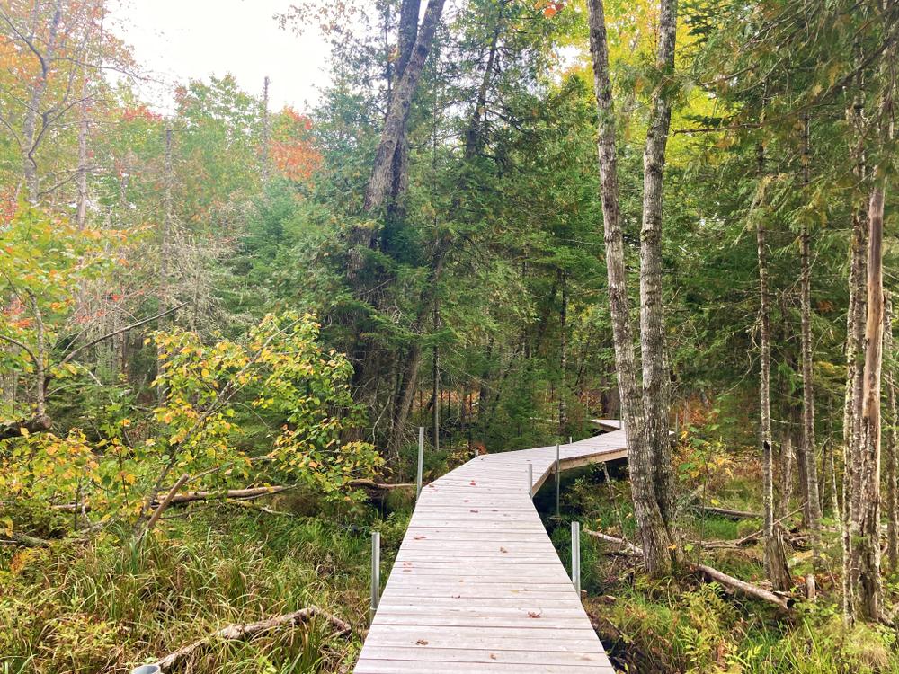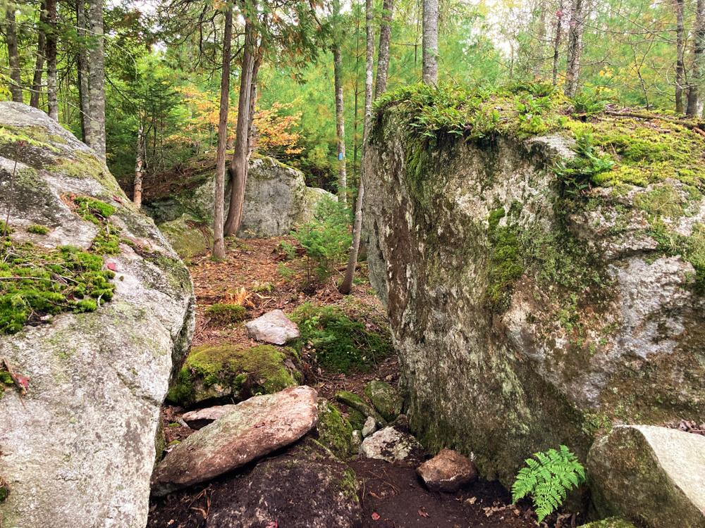 Continuing straight past the sign-in box, the ~0.2 mile Boardwalk Trail leads east across a wetland via boardwalks and bog-bridging to the ~0.5mi Doghair Fir Loop. This loop features a vernal pool, large boulders, mature forest, balsam thicket, and views of the fen from the eastern edge.