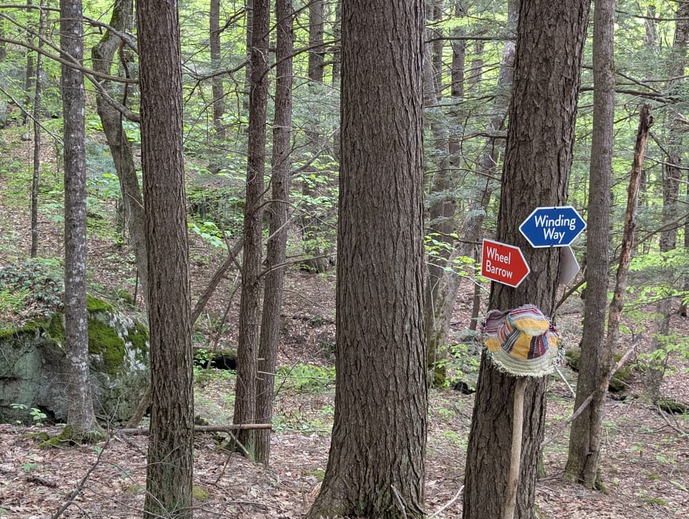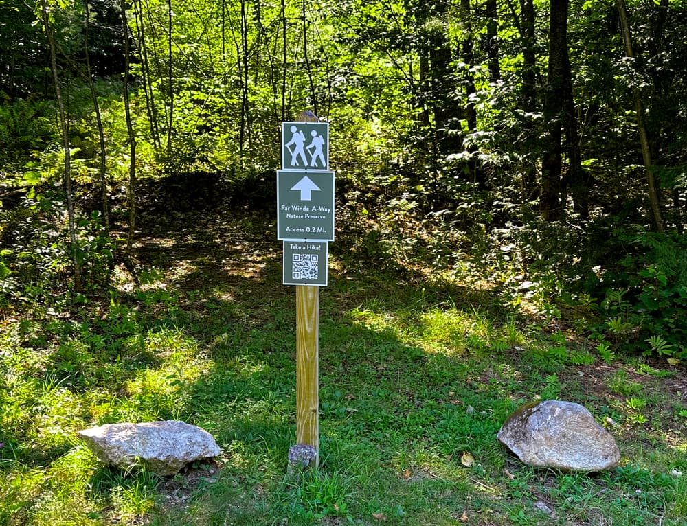 A moderate path leading to the Far Winde-A-Way kiosk and trails, following old farm and logging roads.