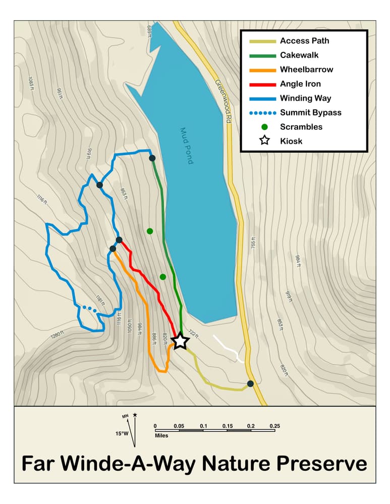 Take ME-26 east from Bethel, and go approximately 3 miles to Greenwood (aka Locke Mills). Turn right onto Howe Hill Road, then take the first left onto Greenwood Road. Go approximately 8 miles on Greenwood Road to the Far Winde-A-Way Nature Preserve access path on the left.
