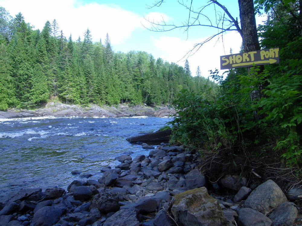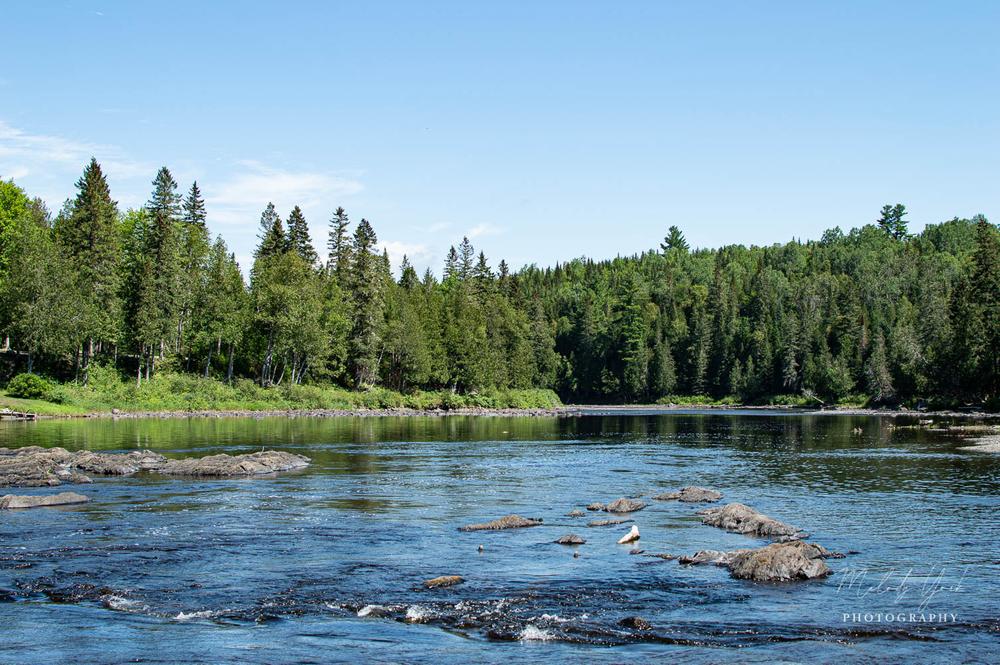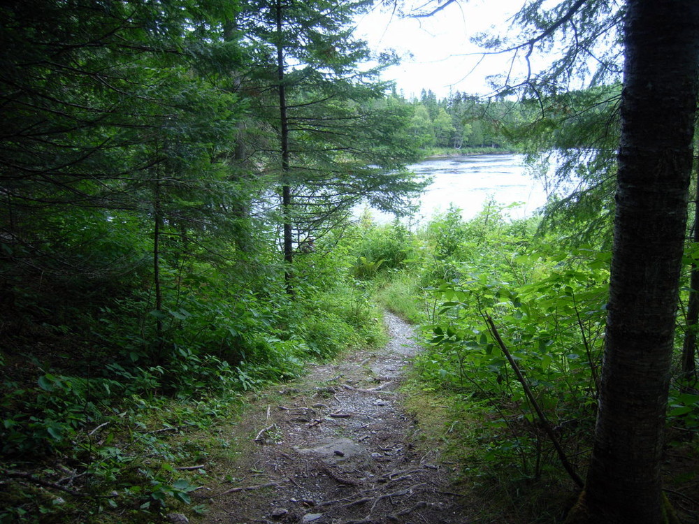 The Fish River Falls Trail is a short woods trail leading from the grass airstrip at the end of the Airport Road down to the Fish River Falls on the Fish River, a Class IV rapid. Once the falls is reached, a small network of trails connects the portage routes around the falls with the access trail. There is also a large campsite with a picnic table next to the falls. The trails next to the river offer great views of the river and the falls. Hikers can also stand on the rocks in the river next to the falls to enjoy the scenery. However, attention must be paid because of the slippery surface of the rocks and the turbulent water of the falls.