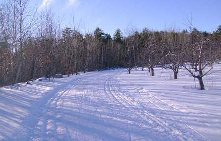 On the site of a working commercial apple orchard, Five Fields Farm has offered cross-country skiing and winter recreation for over a decade. The trail system starts on the back lawn of the buildings and total a 13.5 kilometer (8.4 mile) network. Looping around the orchards, it connects with the logging roads, and links with lands owned by abutters, including the Loon Echo Land Trust on Bald Pate Mountain.