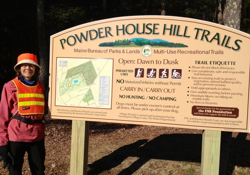 Bonney Woods CorporationMain trailhead on Anson Street/Titcomb Hill Road: From ME Route 4/ME Route 27 (Main Street) in downtown Farmington, turn right onto Anson Street on the north side of the Franklin County Courthouse. Continue on Anson Street 0.5 miles up Anson Street hill to the parking area turnout on the left, which is marked with a green sign. You will also spot a larger, yellow Powder House Hill Trails kiosk including a map and information. Flint Woods and Village Woods are about an eighth of a mile beyond the Bonney Woods parking area which is on the right.