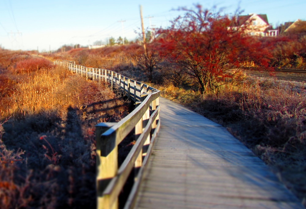 The Fore River Trail is a gravel and boardwalk trail along the Fore River, through wooded and marshy areas. Subtle overgrown land-forms indicate the location of old wharfs and roads. At the Thompson’s Point loop, warehouses and tidal inlets contrast industry with nature, and offer good views of the Fore River estuary and the Portland Jetport. This section is flat gravel and boardwalk, with some uneven packed-earth surfaces. Signs direct users in a loop along the road back to the Portland Transportation Center with its connection to the Fore River Parkway.
