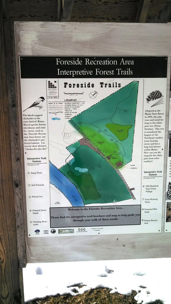 The Topsham Recreation Fields span the adjacent land areas near the fields on the Foreside Road. The trails meander in and out of the fields, as well as bordering the Androscoggin River. These trail network runs for a couple of miles and is best suited for runners and field or playground users looking for a walk in the woods. A trail kiosk with a map of the area can be found in the central parking lot, near the playground.