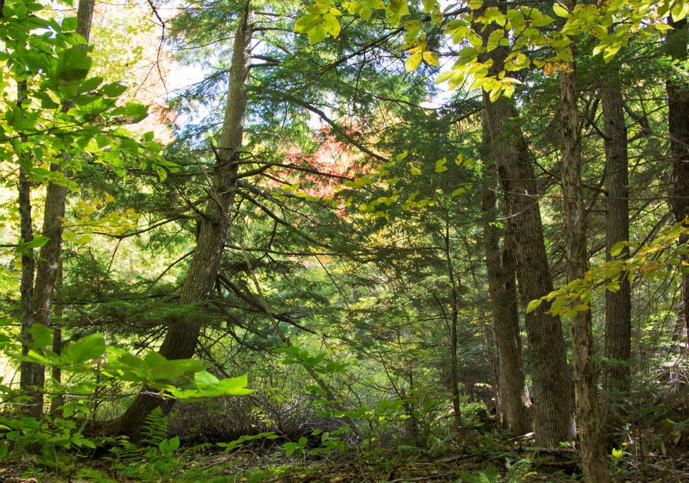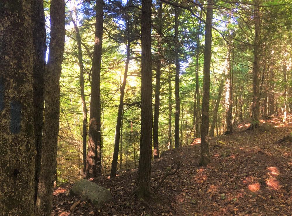 The trail, marked in blue, leaves the trailhead kiosk on an old woods road before quickly turning off into the woods on a narrow footpath. The path loops through mixed woods and hemlock groves, where barred owl, hawk and deer sightings are frequent. The property is home to myriad vernal pools, at least three of which qualify as significant according to the State, due to the tremendous level of springtime use by wood frogs and spotted salamanders.