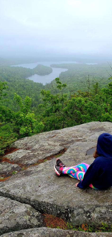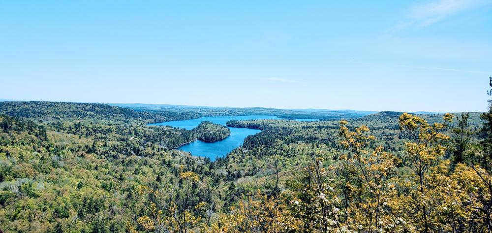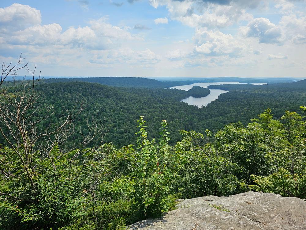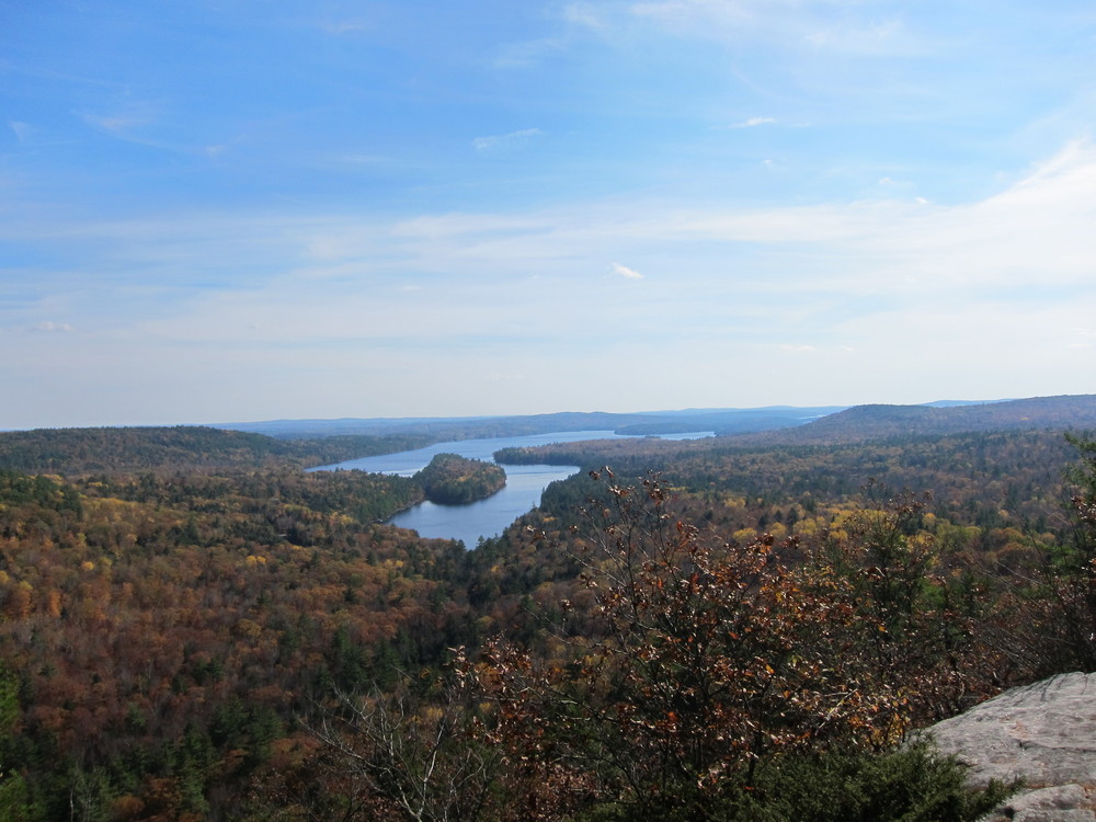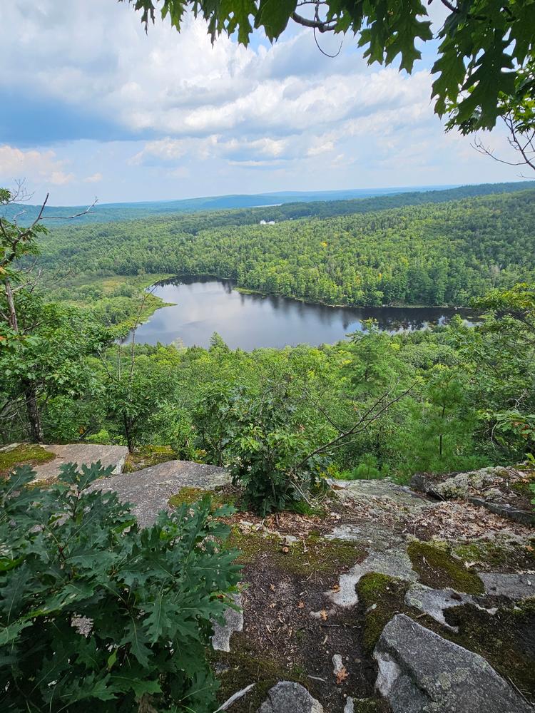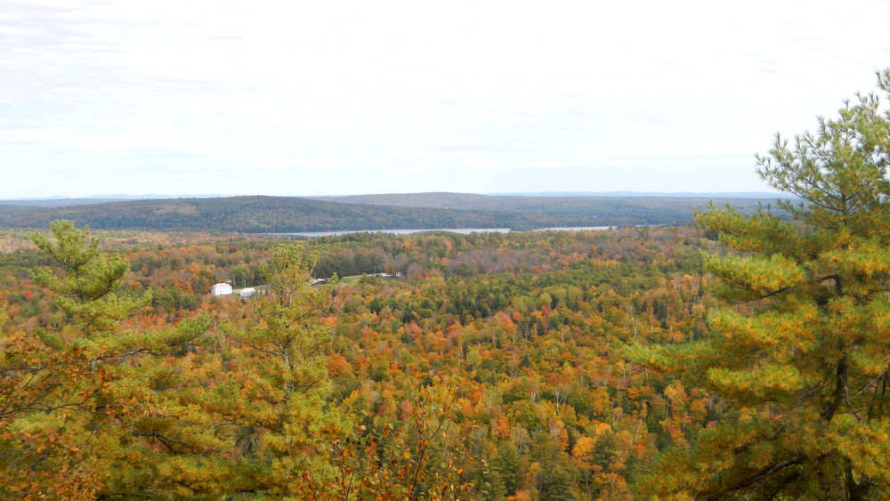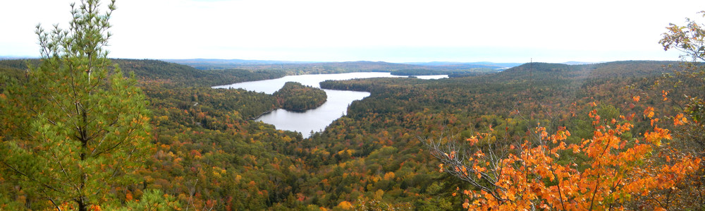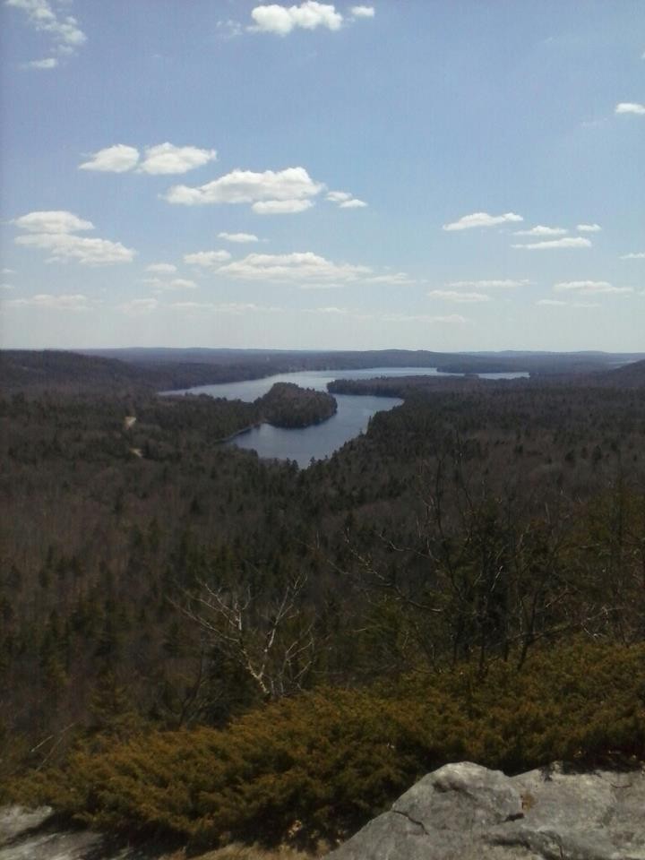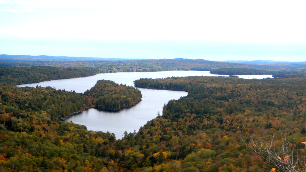 The trail heads east from the parking area and soon splits at the trail information kiosk. Stay left for a more direct path to the summit. After a short climb, the trail swings south and ascends the ridge of French Mountain (716') to reach a rocky precipice with stunning views of Long Pond. As the trail opens up near the summit, the first views are of tiny Whittier Pond to the east, Mount Phillip to the northeast, and Long Pond to the southeast. The trail continues along open rocks above steep cliffs to a viewpoint overlooking the northern end of Long Pond. From here you can also see Great Pond, The Mountain, and Belgrade Lakes Village.