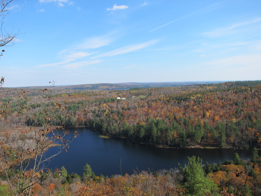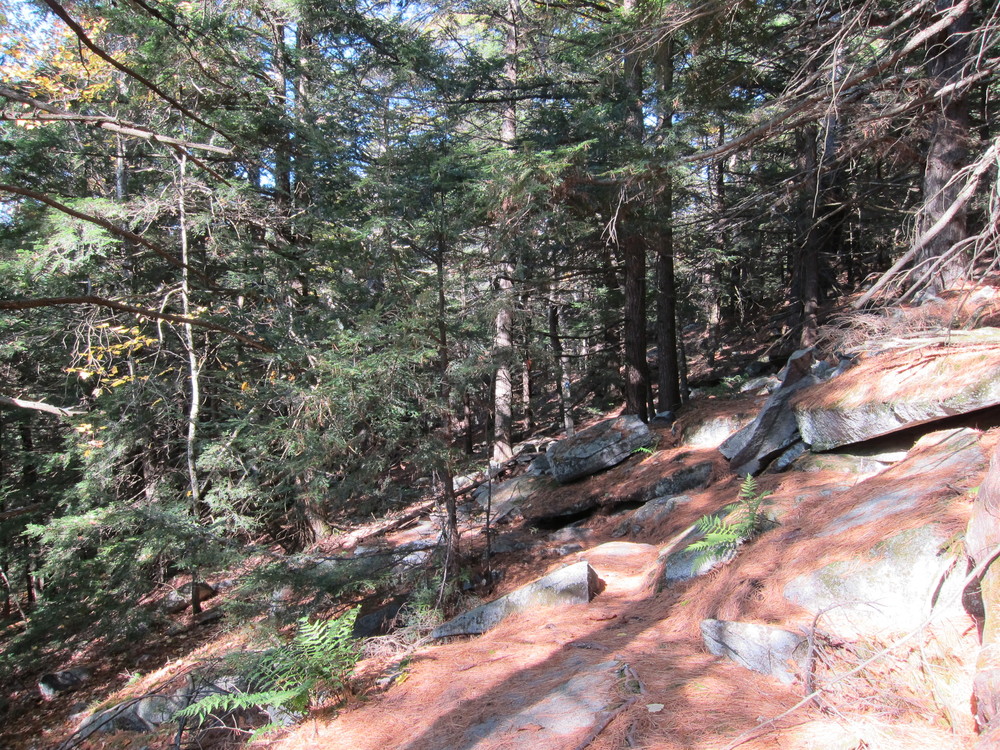Just south of the summit overlook, the trail turns west into the woods and descends several switchbacks before turning north and gradually descending through woods, back to the junction and parking area.