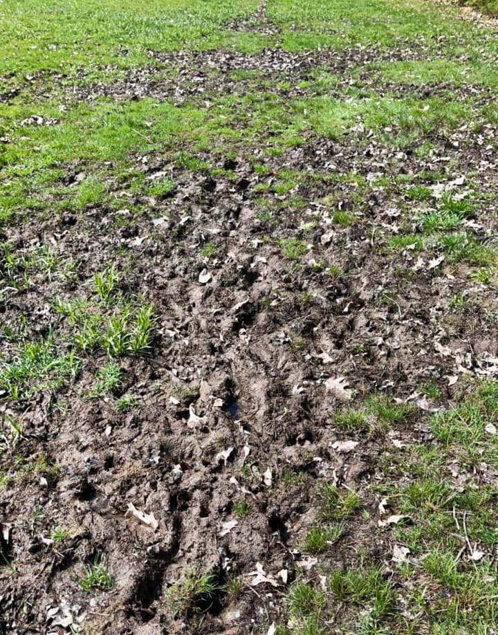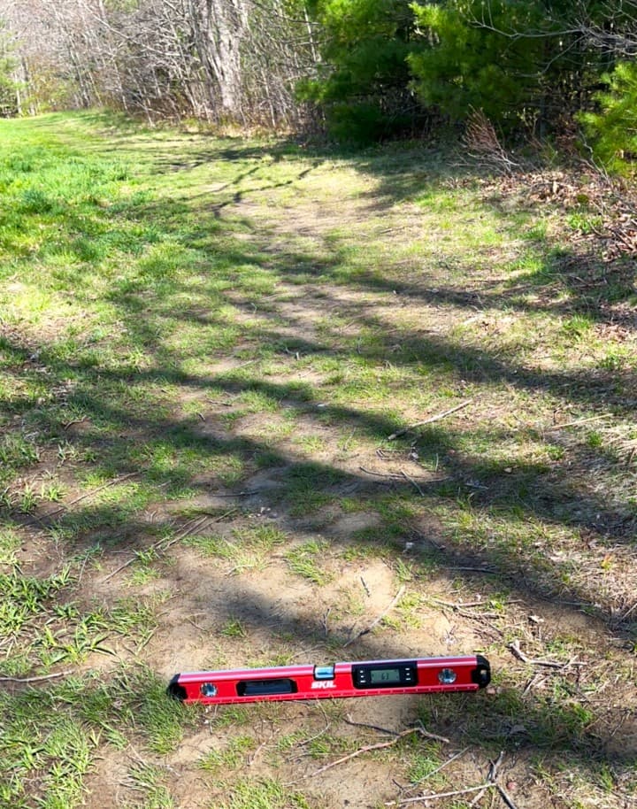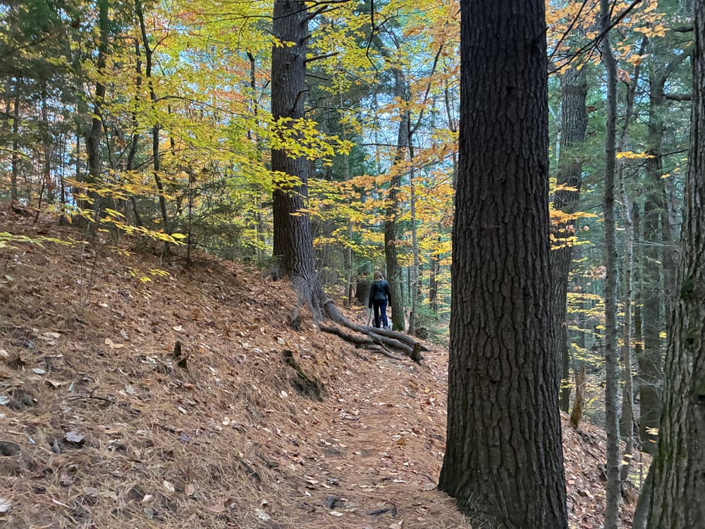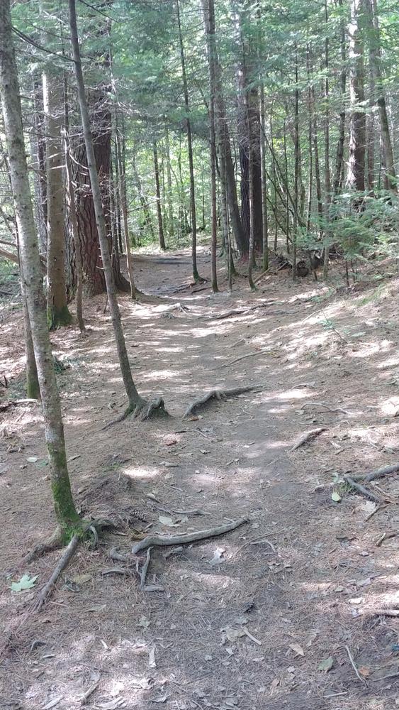 The Maine Trail is a mix of mowed grass, dirt lane, and natural trail beds with roots and rocks and some steep areas.