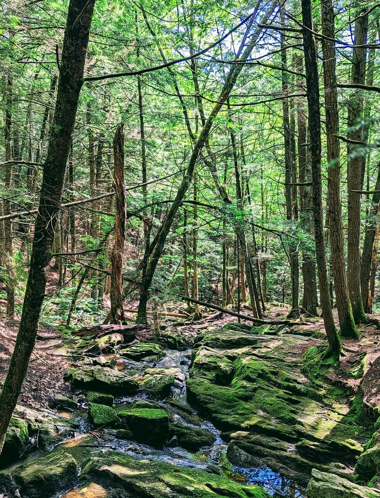 The Waterfall Trail parallels a scenic brook and leads to a waterfall with picnic table. The Waterfall Trail and Brook Trail have natural trail beds with roots and rocks, are narrow at times, and many inclines, some of which are steep.