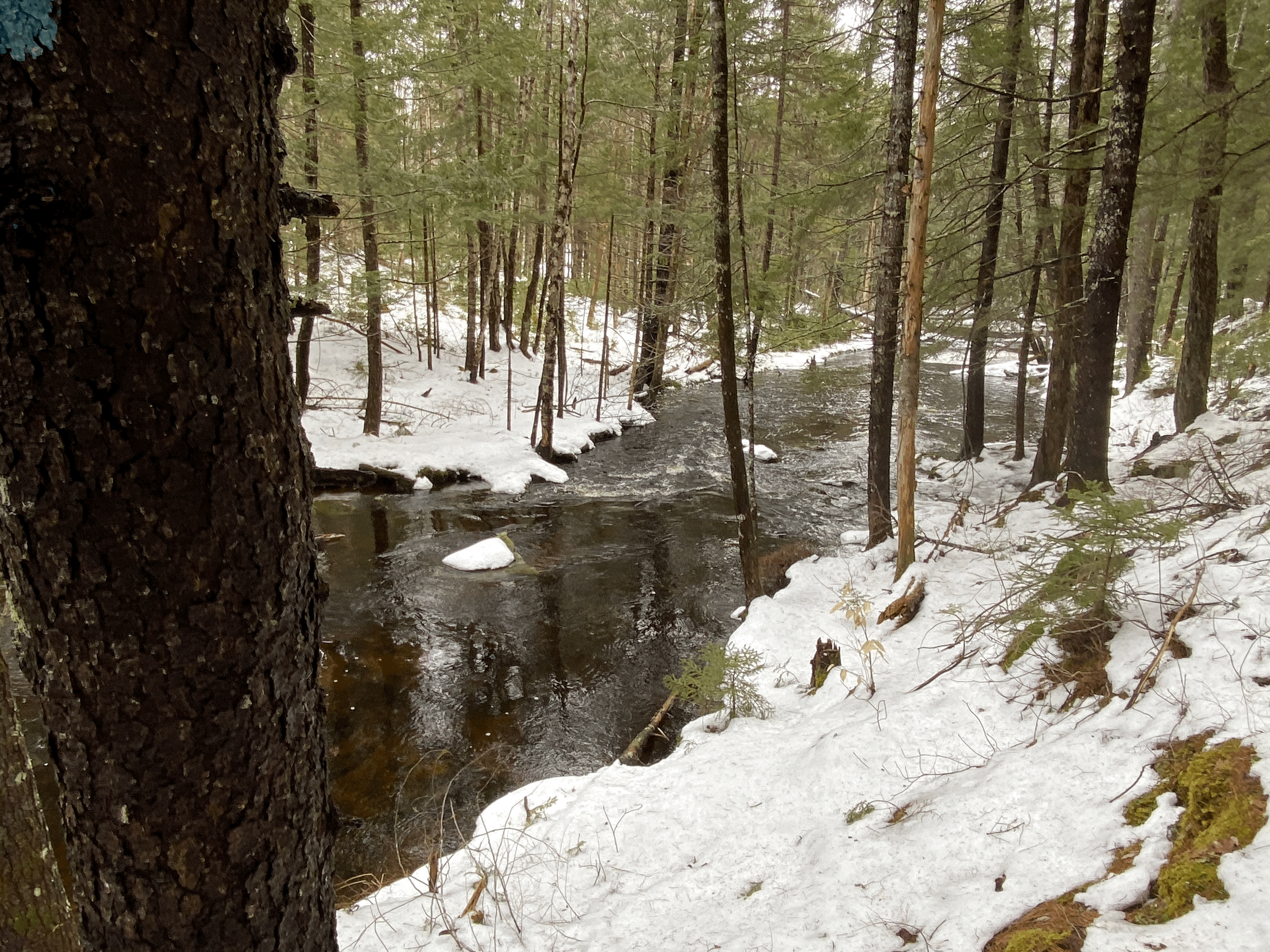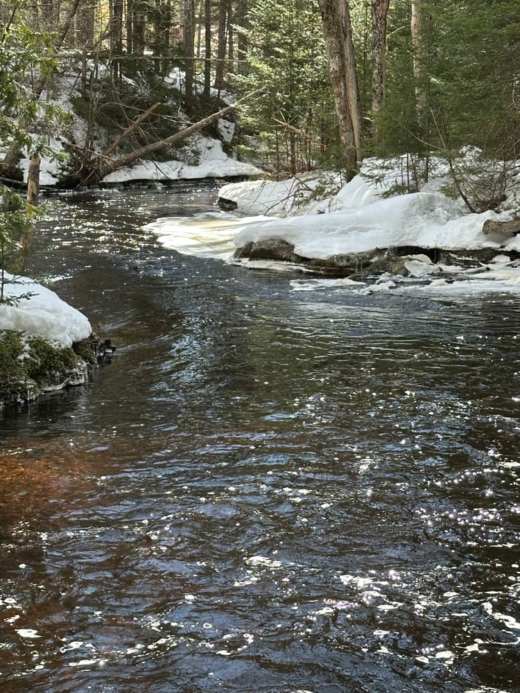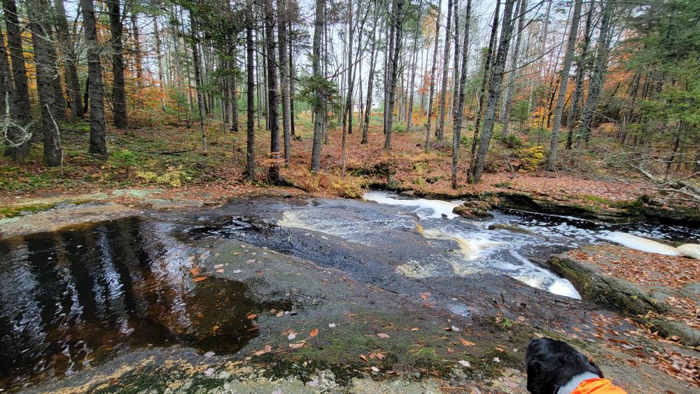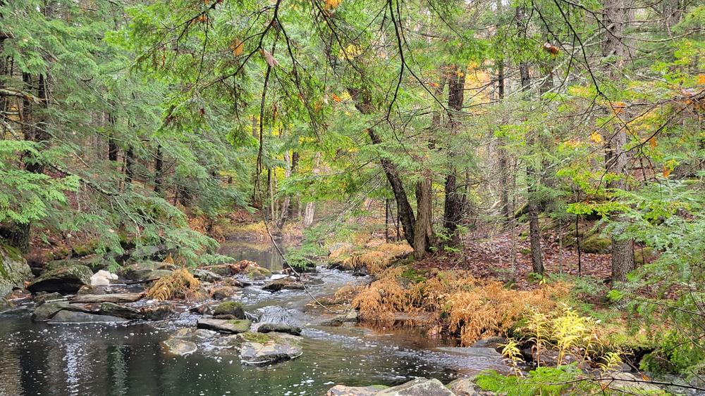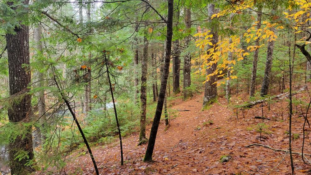 The Goose River trail follows the Goose River before looping back through the woods to Finntown Road. The Mill Pond Trail begins across the road 400 feet west of the kiosk. It skirts the edge of the bog before reaching the southern edge of Mill Pond.