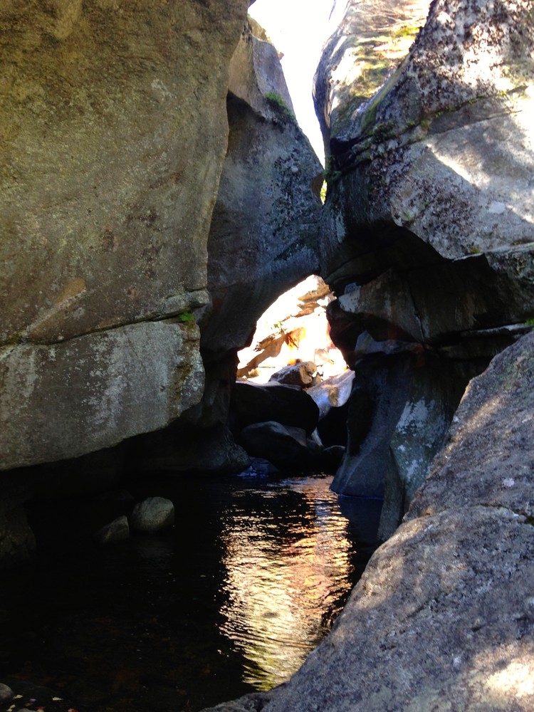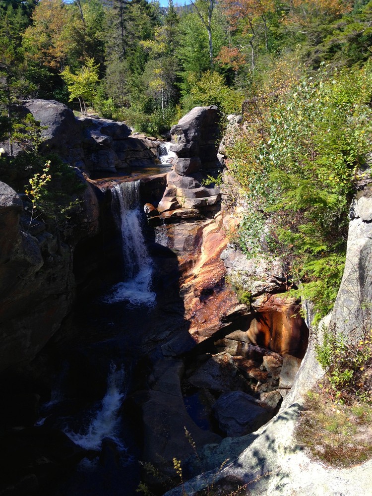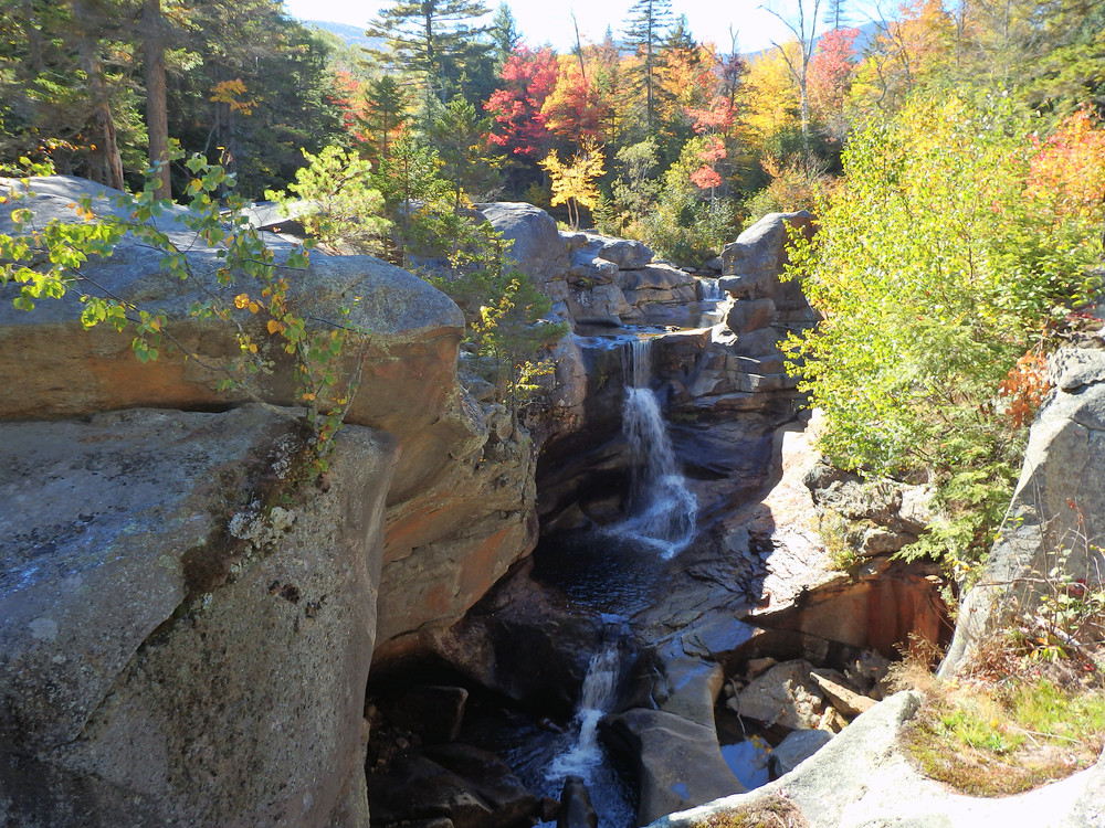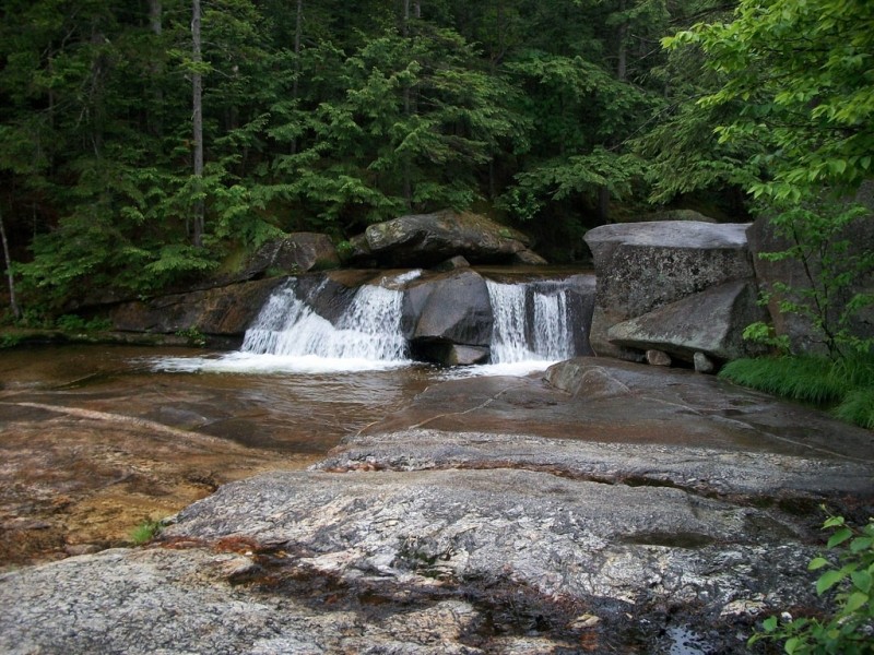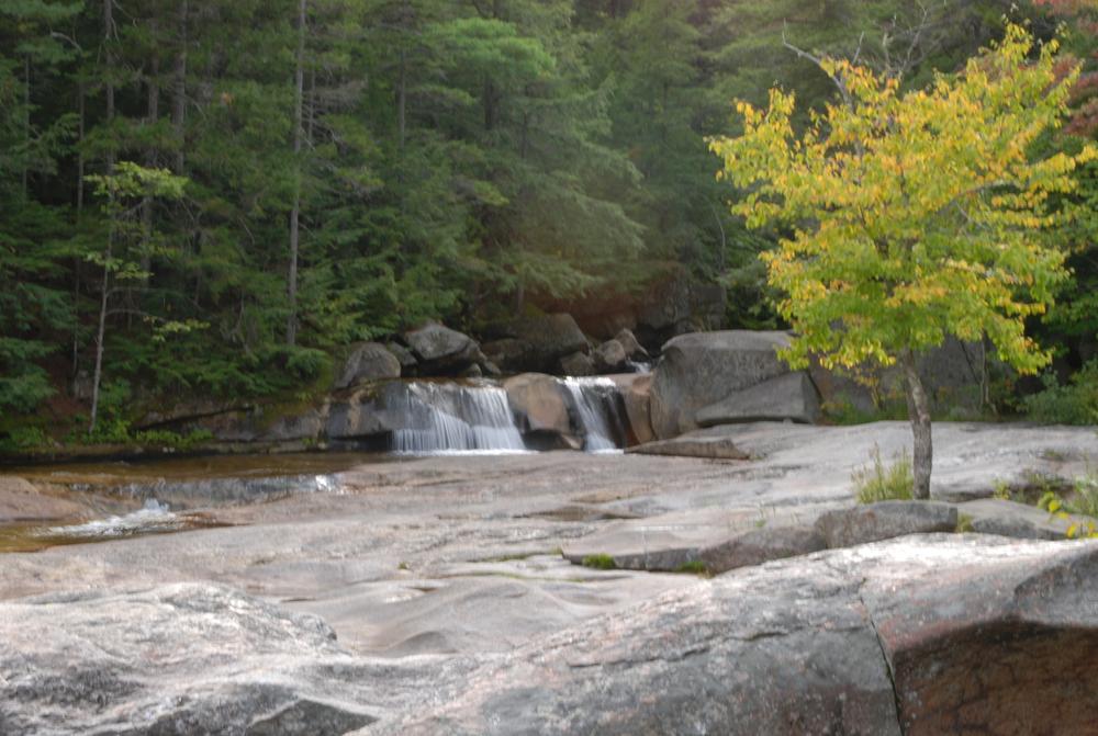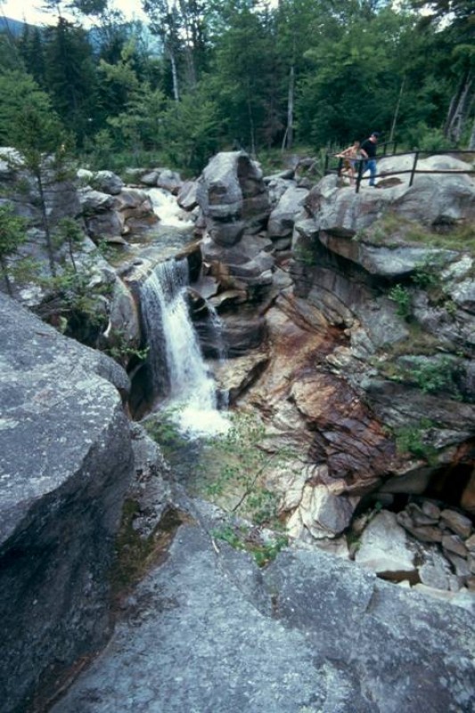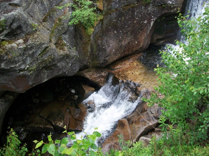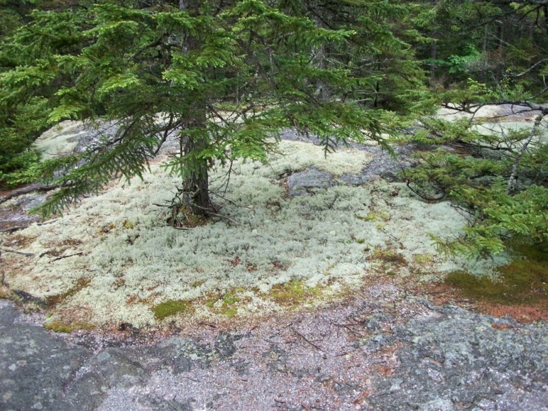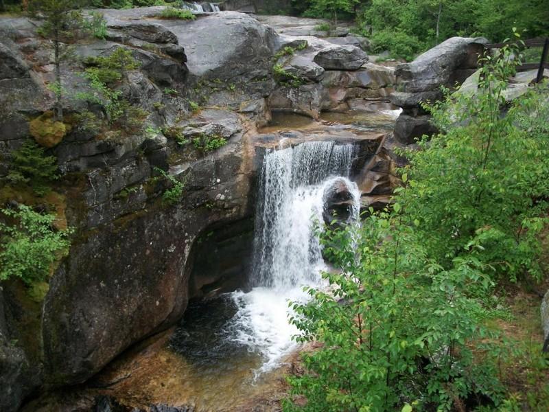 Moose Cave (0.4 miles loop, easy): Another 0.8 mile further, one can find Moose Cave located within a 45-foot-deep canyon of bedrock where water skirts boulders and temporarily disappears into a cave beneath a granite slab. The trail follows a 600-foot long gorge carved through granite by glacial meltwater. Hikers are urged to show caution on the slippery rocks so that one will not fall in the gorge like the unlucky moose for whom Moose Cove was named. The trail also loops through a moss garden located on the ledges of the mixed growth forest. Several species of lichen inhabit this garden including "Reindeer Moss" which is native to the Arctic Tundra. There is also an excellent view of Table Rock from Route 26 at this point.