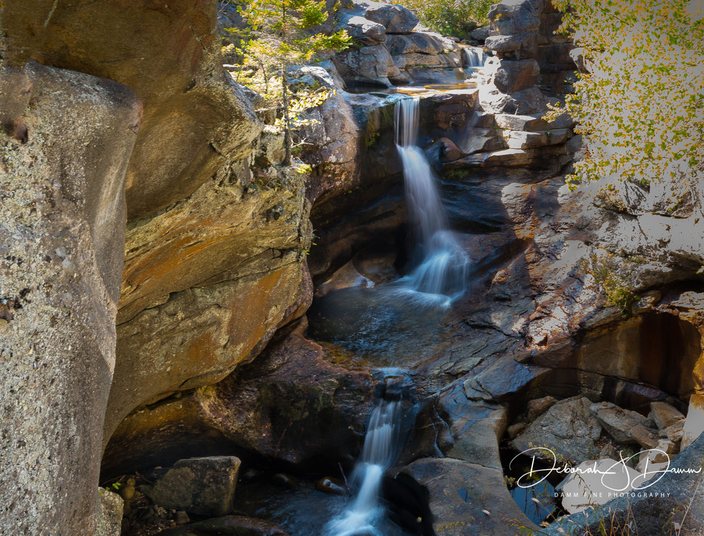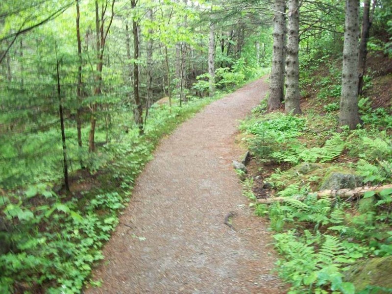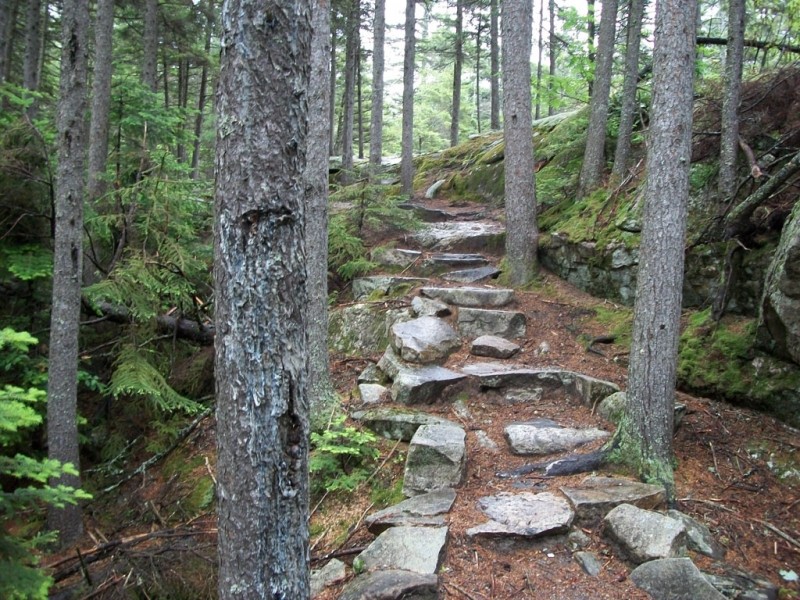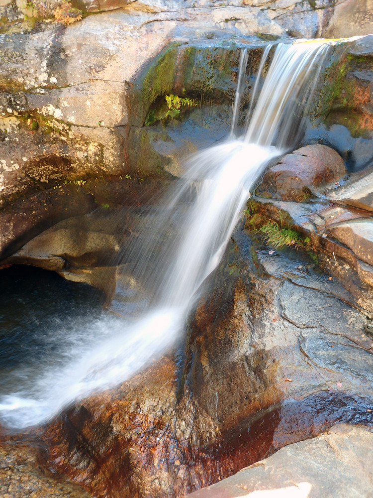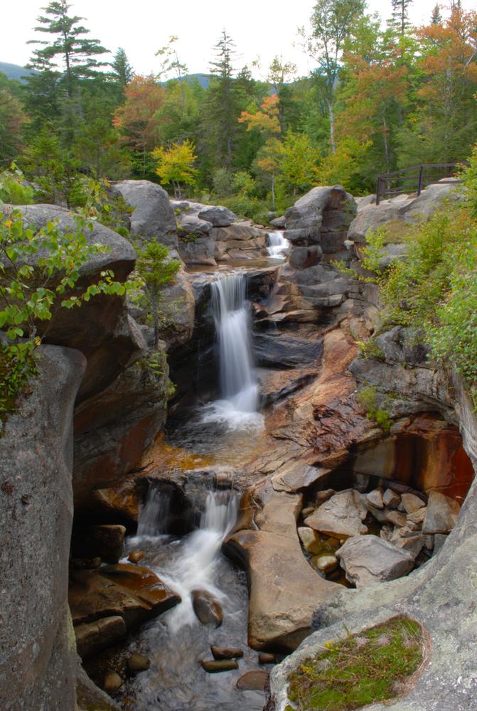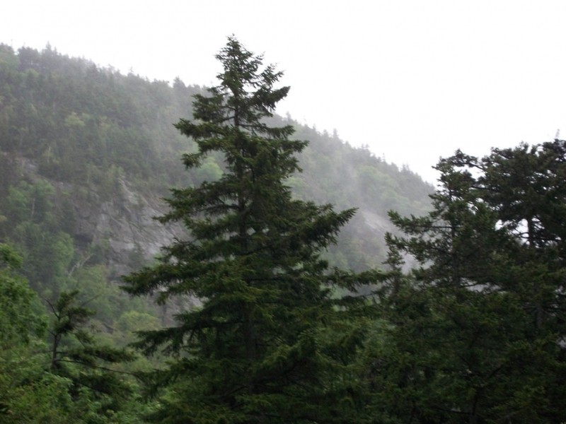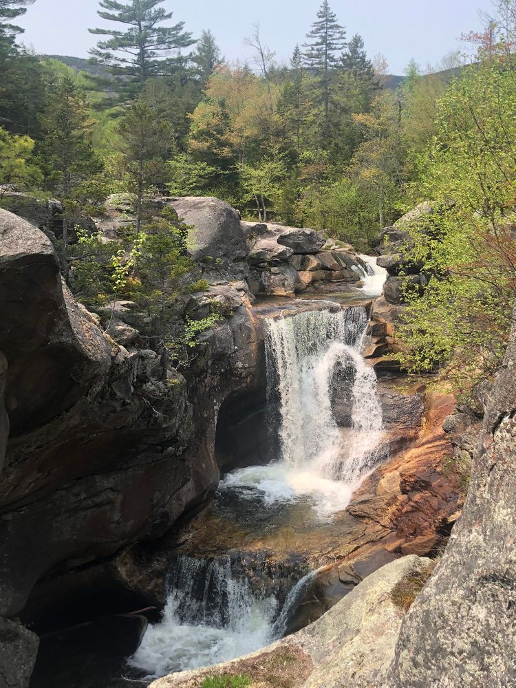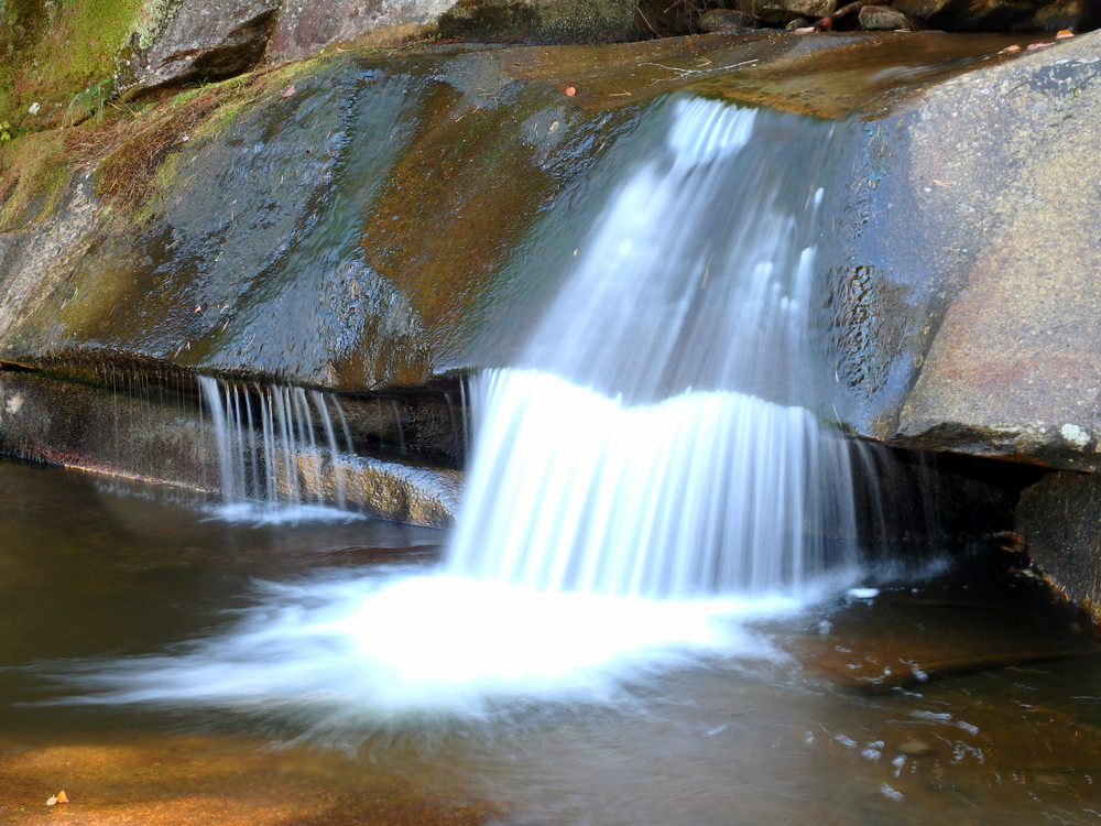 Moose Cave (0.4 miles loop, easy): Another 0.8 mile further, one can find Moose Cave located within a 45-foot-deep canyon of bedrock where water skirts boulders and temporarily disappears into a cave beneath a granite slab. The trail follows a 600-foot long gorge carved through granite by glacial meltwater. Hikers are urged to show caution on the slippery rocks so that one will not fall in the gorge like the unlucky moose for whom Moose Cove was named. The trail also loops through a moss garden located on the ledges of the mixed growth forest. Several species of lichen inhabit this garden including "Reindeer Moss" which is native to the Arctic Tundra. There is also an excellent view of Table Rock from Route 26 at this point.
