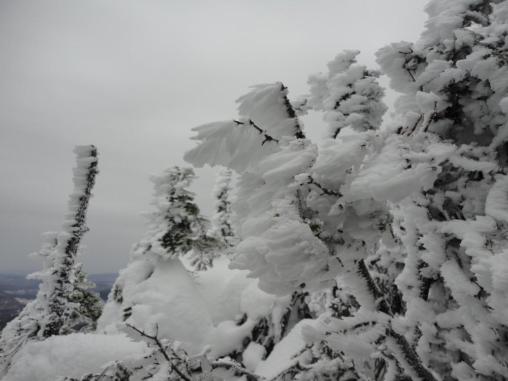 Eyebrow Loop Trail (2.2 miles round trip, advanced): The Eyebrow Loop Trail rises steeply to a 2,900-foot shelf-overlook on Old Speck Mountain. Following the white-blazed Appalachian Trail southbound for 0.1 miles, look for the start of the orange-blazed Eyebrow Trail on the right. The trail gently rises as it passes through a stand of hardwood trees until it reaches a steeper cliff section. Portions of the orange-blazed ascent involve ladders and steel rungs. It is suggested that users descend by following the Appalachian Trail back to the parking lot and trailhead. While still steep, this avoids climbing down steep sections. Hikers wanting to avoid the rungs and ladders can go up and back on the AT portion for a 2.6-mile round-trip. The Eyebrow may not be achievable for small children, especially in wet conditions.