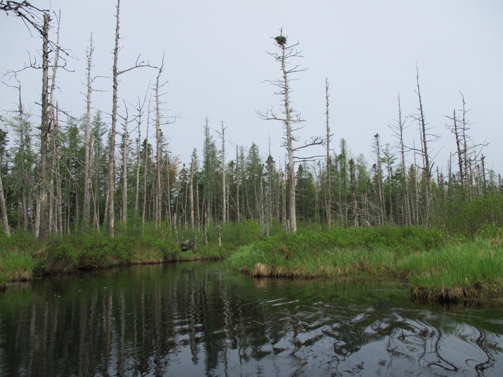 If beginning at either put-in on the lake, stay to the left (Southwest) of the islands for about a mile to reach Grant Brook. At this point the brook is about 200 yards wide, technically part of the lake. Large marshes extend beyond both banks, with trees set far back from the water. Flat water extends over a mile inland as the stream narrows and begins turning in wide oxbows. This is an ideal place to spot wildlife, including a resident family of nesting osprey. Eventually the brook is blocked by beaver dams, which can be easily portaged around to extend the paddle a short distance farther upstream.