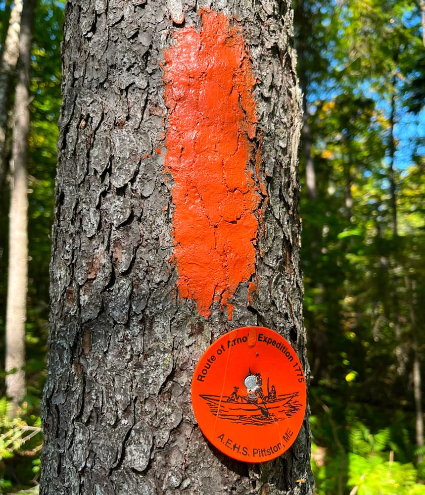 The trail is marked by orange blazes, except for the section of the AT which is marked by white blazes. There may be a question as to which direction would be the best to hike, east to west or west to east. Either is a fine hike! However, to more closely emulate the experiences of the soldiers of the 1775 Expedition, the better way is east to west, Wyman Lake (Kennebec River) to Flagstaff Lake (Dead River).