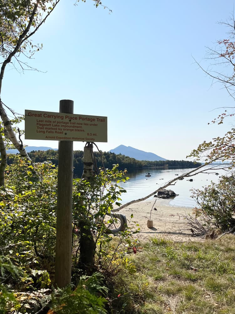 The west end of the Great Carrying Place Portage Trail begins on the east shore of Flagstaff Lake. To get there, follow the Long Falls Dam Road northward from North New Portland which leaves ME-16 at this point. Follow Long Falls Dam Road north for 21 miles. Leave cars at the prominent AEHS sign at the junction of Loing Falls Dam Road and the gravel Spring Road which turns eastward. This is also a prime point to pick up hikers traveling westward from the other end. Walk downhill northward along Long Falls Dam Road for 75 yards, then turn left, leaving road. Cross a wide logging yard area then reenter woods on an old tote road. The route is marked by orange blazes. It leads 0.3 miles to the shore of the lake and the west end of the GCP Portage Trail.