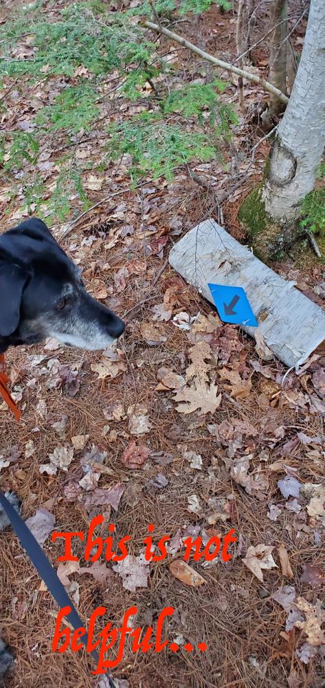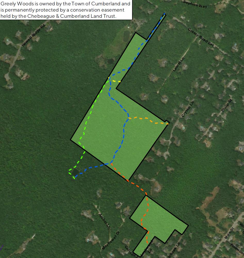 The trail from Greely Road Extension is blazed blue; the trail from Lockwood Lane is blazed orange; the trail from Crystal Lane is blazed yellow.