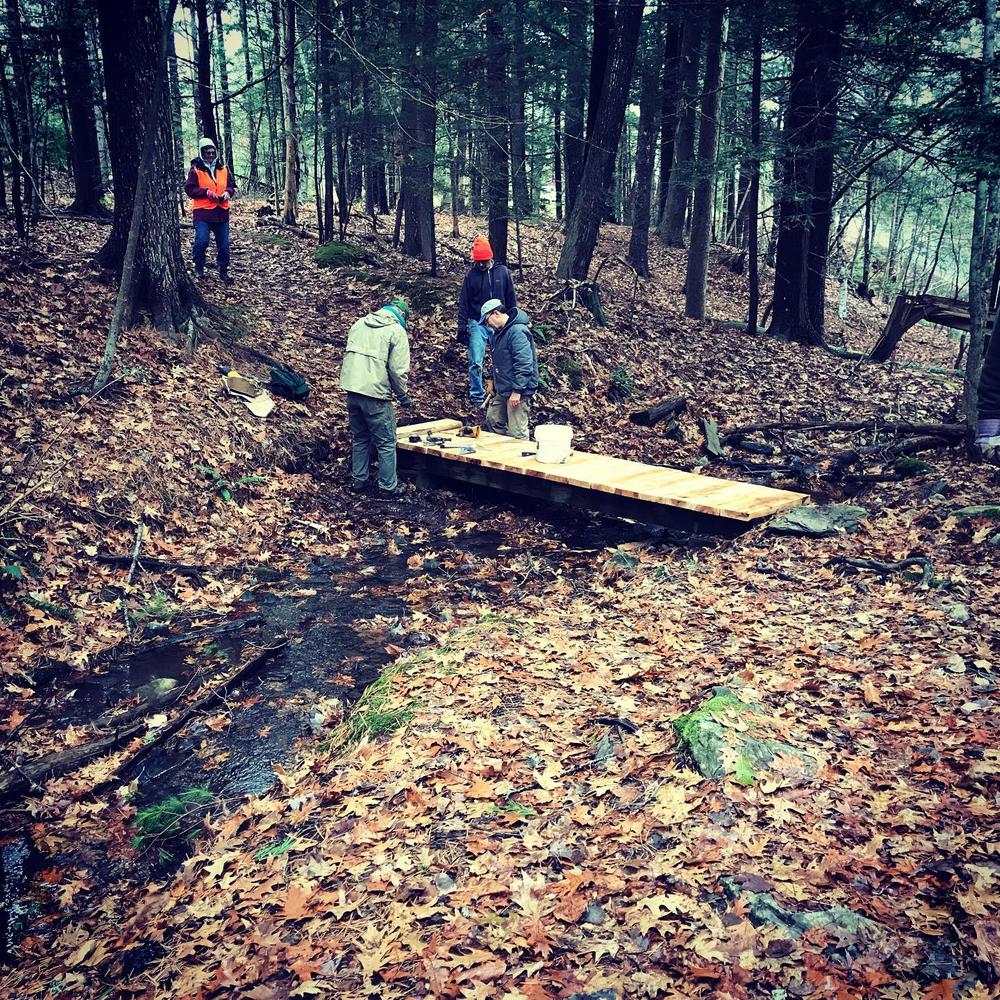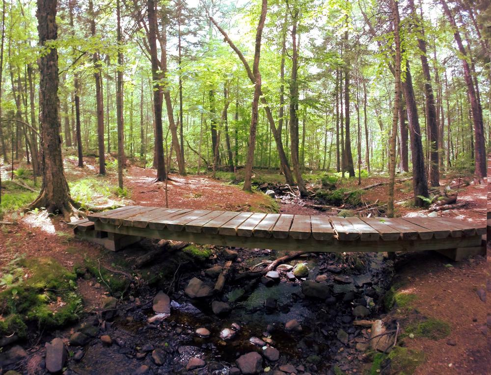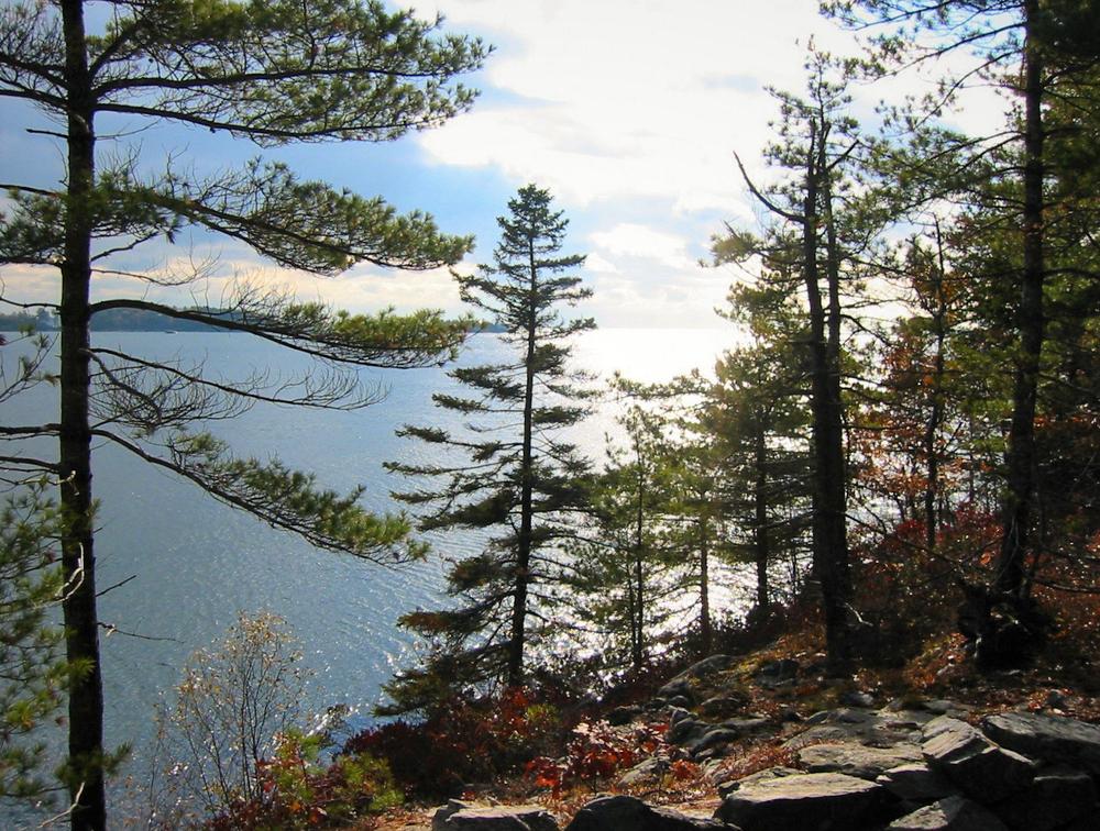 The first 0.3 miles of the trail travel through the woods and across two hand-built footbridges over Ott Stream, a perennial stream that is rust colored due to the tannic and humic acids from a wetland upstream. The trail then comes to a junction with a loop. Just past the junction to the left is a lime kiln chimney cap, a relic of Rockport Harbor’s lime kilns. Circling around the loop in a clockwise direction, the trail reaches the shore after about 0.2 miles. A stone chair sits along the trail by the shore, from which to take in views of Rockport Harbor. Returning back along the same 0.3 mile trail from the loop makes for a total hiking distance of 1 mile.