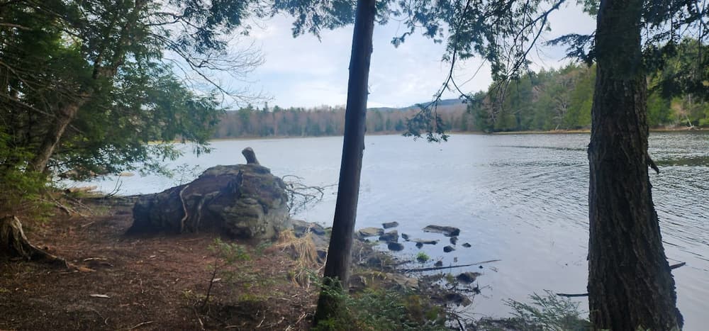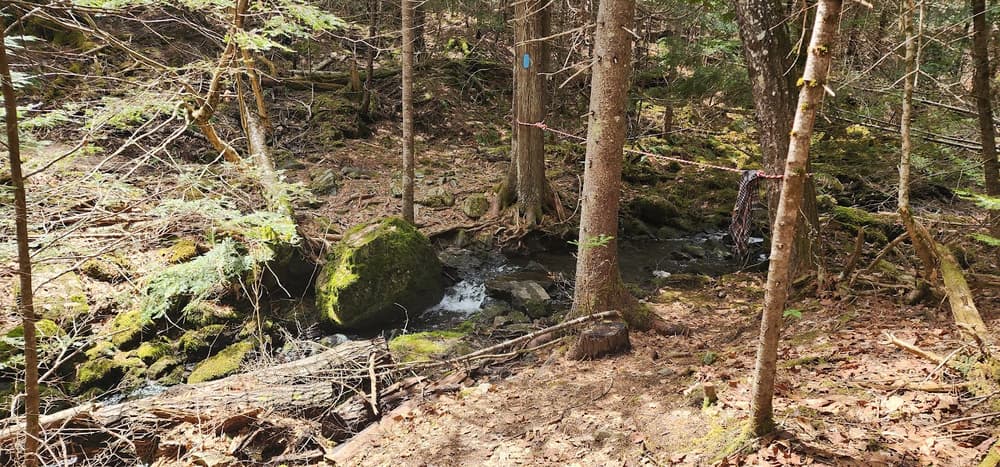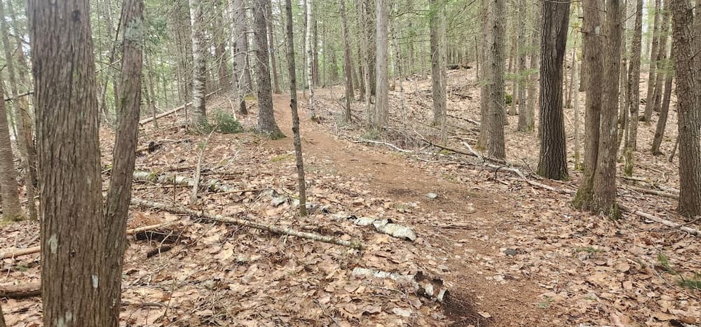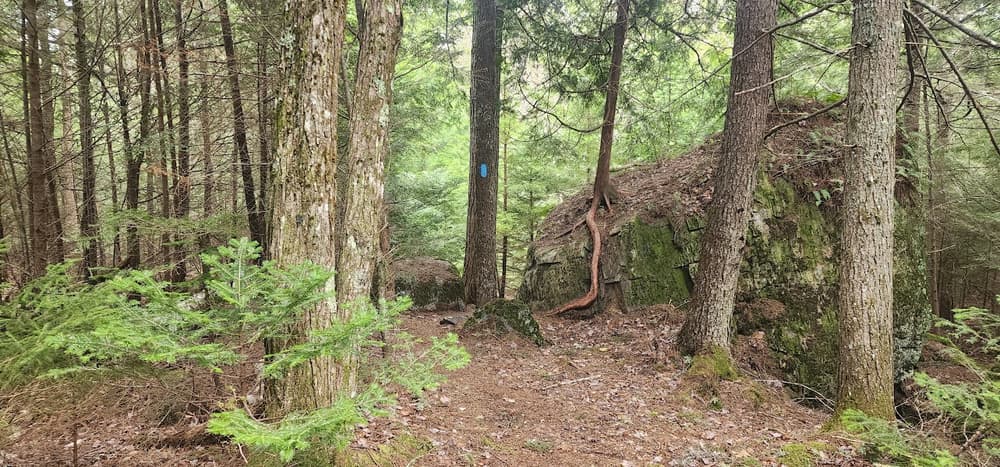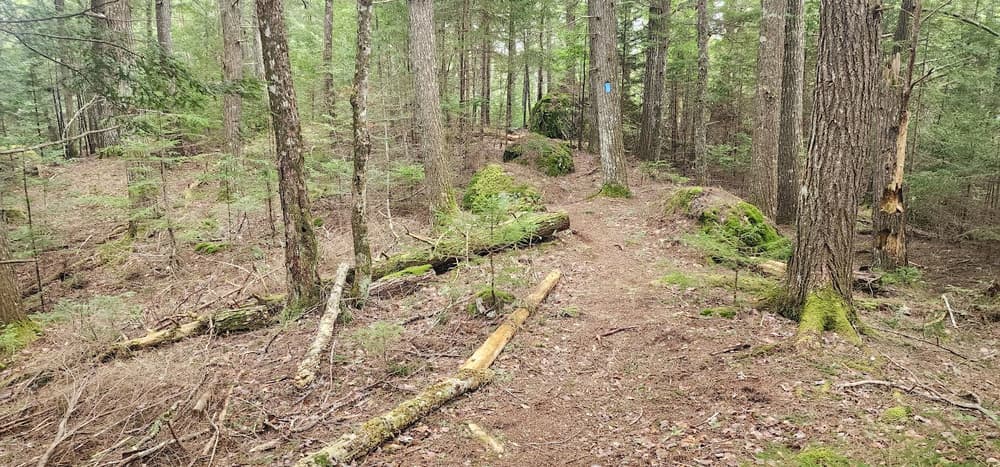 The Hemlock Trail at Dead River West follows glacial ridges in a mature forest with views of a marsh, coming out on shore of the Dead River. Huge boulders - glacial erratics - can be found along the trail. It is 0.5 miles to the river from the trailhead, or 1 mile round trip.